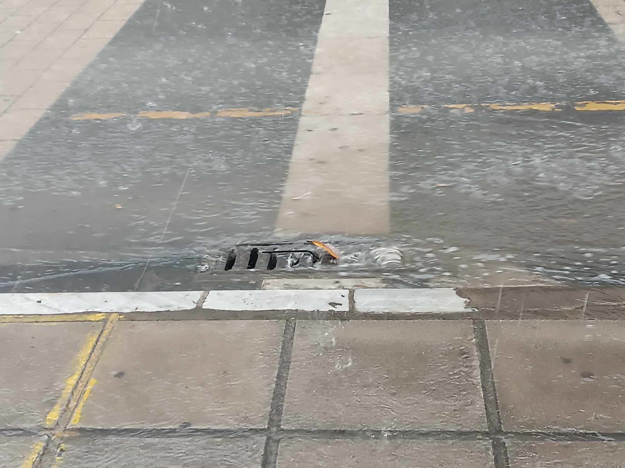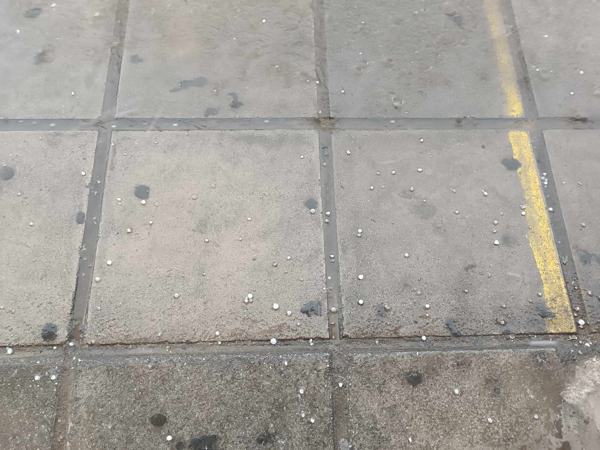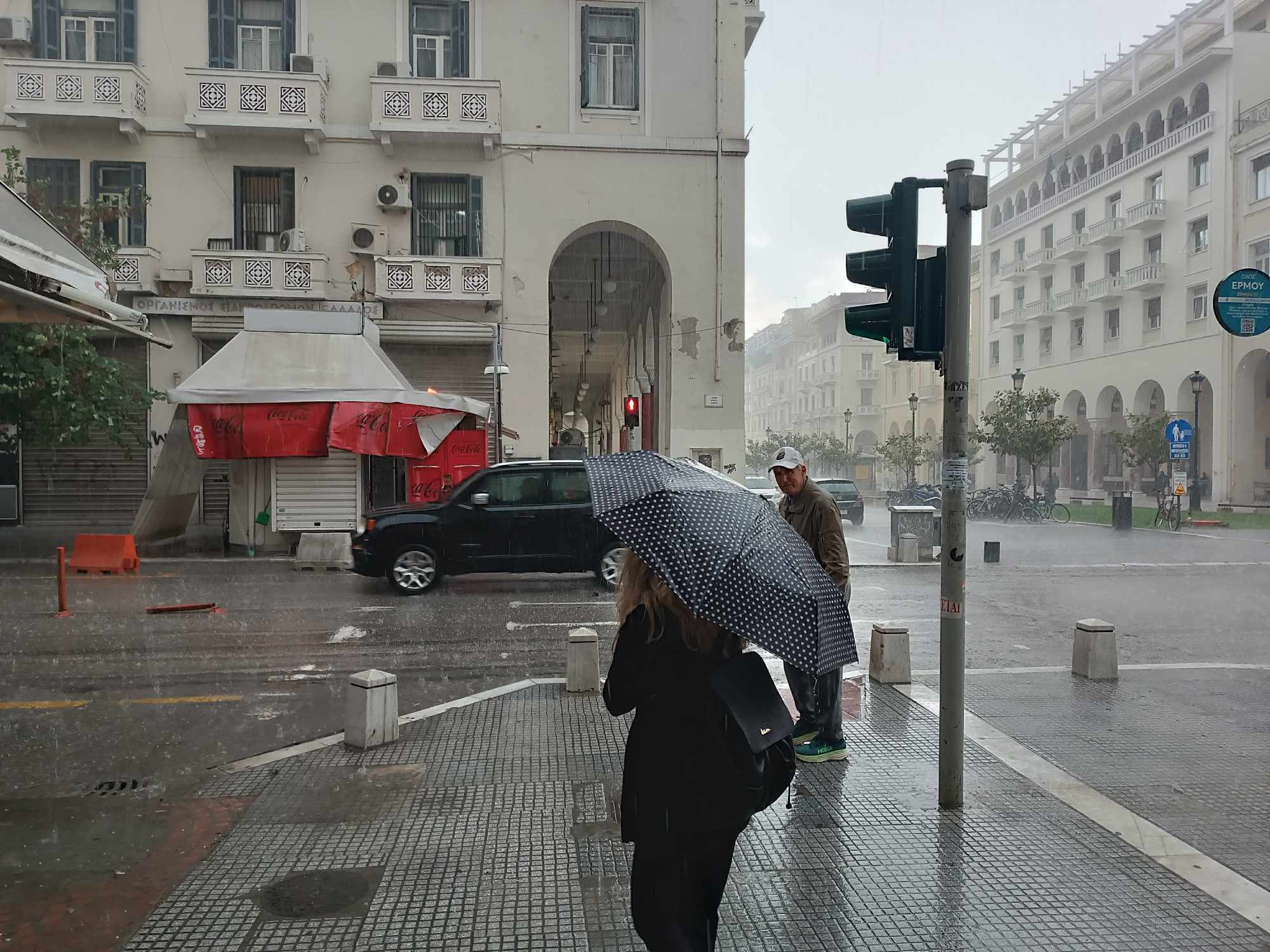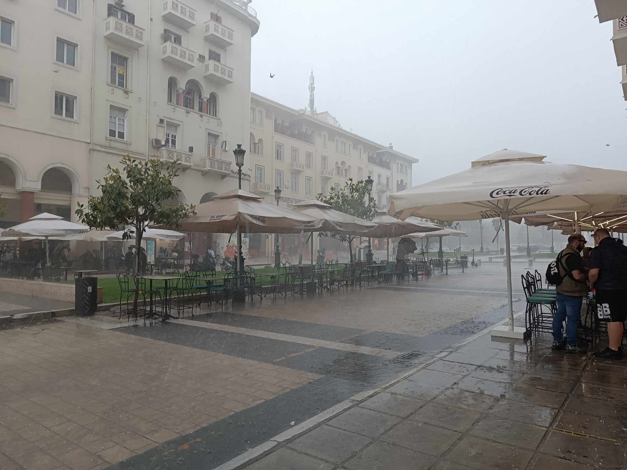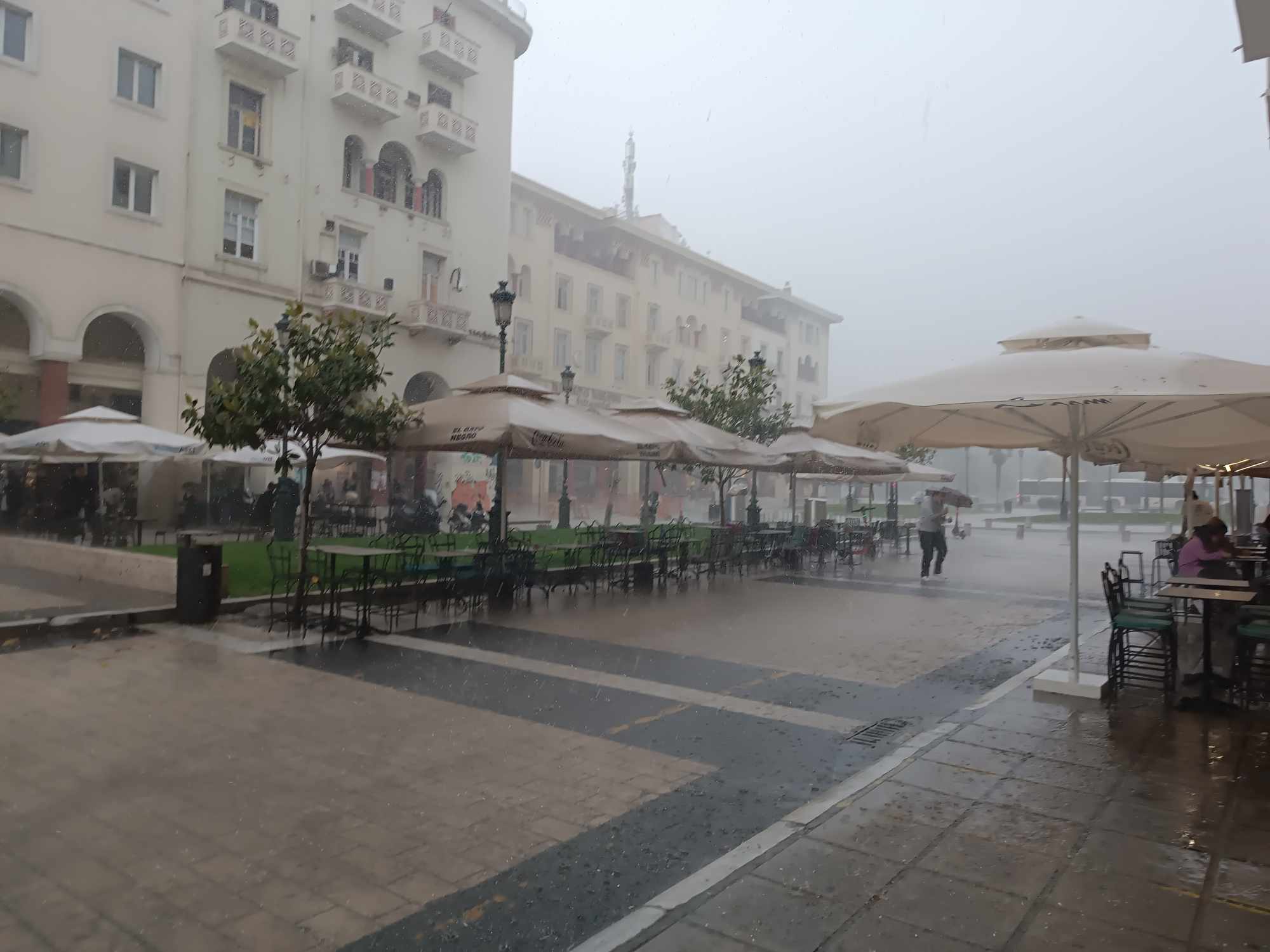 Ενώ η μέρα ξεκίνησε με ήλιο και ζέστη, ξαφνικά ο καιρός άλλαξε διαθέσεις και λίγο πριν τις 17:00, άρχιζε ισχυρή βροχόπτωση με έντονο χαλάζι στο κέντρο της πόλης.