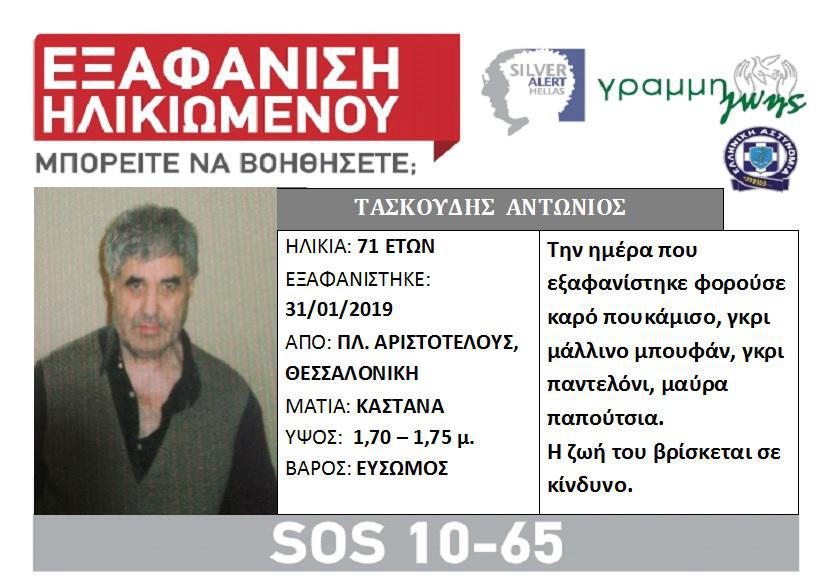 Ο εβδομηνταδυάχρονος αγνοείτο από τις 31 Ιανουαρίου. Μία ημέρα αργότερα, την 1η Φεβρουαρίου 2019 δηλώθηκε η εξαφάνισή του, ενώ παράλληλα είχε εκδοθεί “Silver Alert” από τη Γραμμή Ζωής.