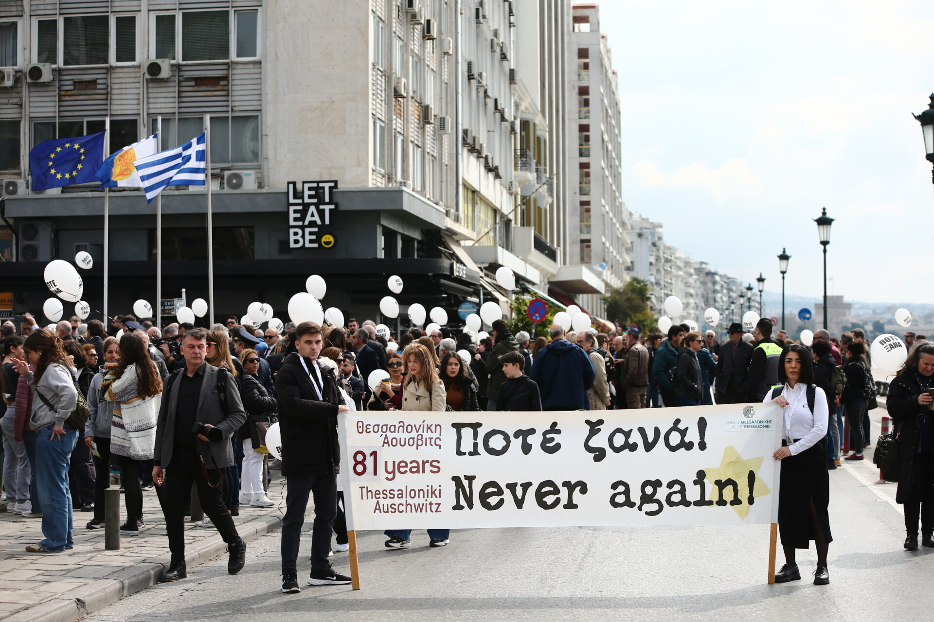 Πορεία Μνήμης με αφετηρία τη μαρτυρική πλατεία Ελευθερίας και τερματισμό τον Παλαιό Σιδηροδρομικό Σταθμό από τον Δήμο Θεσσαλονίκης σε συνεργασία με την Ισραηλιτική Κοινότητα Θεσσαλονίκης, το Αριστοτέλειο Πανεπιστήμιο, το Πανεπιστήμιο Μακεδονίας και το Διεθνές Πανεπιστήμιο Ελλάδος, με αφορμή τη συμπλήρωση 81 χρόνων από την αναχώρηση, από την πόλη, του πρώτου τραίνου του θανάτου για το στρατόπεδο Άουσβιτς – Μπιρκενάου, Κυριακή 17 Μαρτίου 2024.