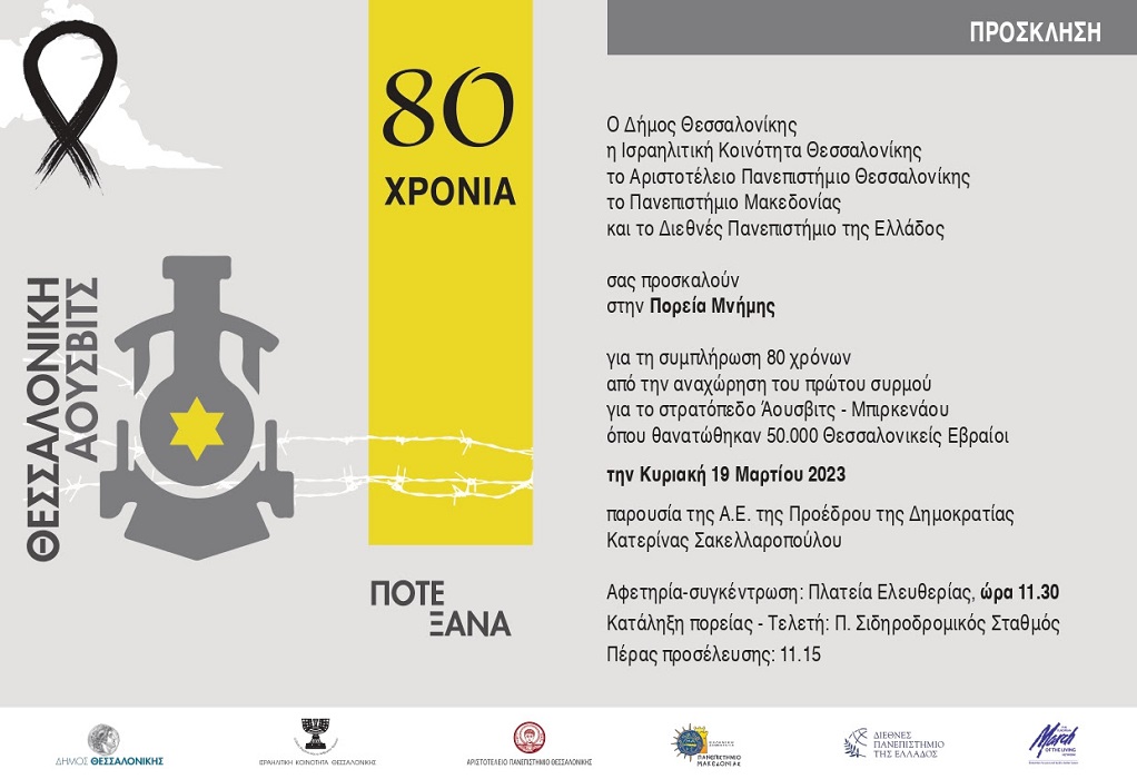 Την πορεία μνήμης για τη συμπλήρωση 80 χρόνων από το σφύριγμα του πρώτου τρένου του θανάτου για το στρατόπεδο Άουσβιτς – Μπιρκενάου, όπου εξοντώθηκαν περίπου 50.000 Θεσσαλονικείς Εβραίοι, διοργανώνουν ο Δήμος Θεσσαλονίκης, η Ισραηλιτική Κοινότητα Θεσσαλονίκης, το Αριστοτέλειο Πανεπιστήμιο Θεσσαλονίκης, το Πανεπιστήμιο Μακεδονίας και το Διεθνές Πανεπιστήμιο της Ελλάδας.