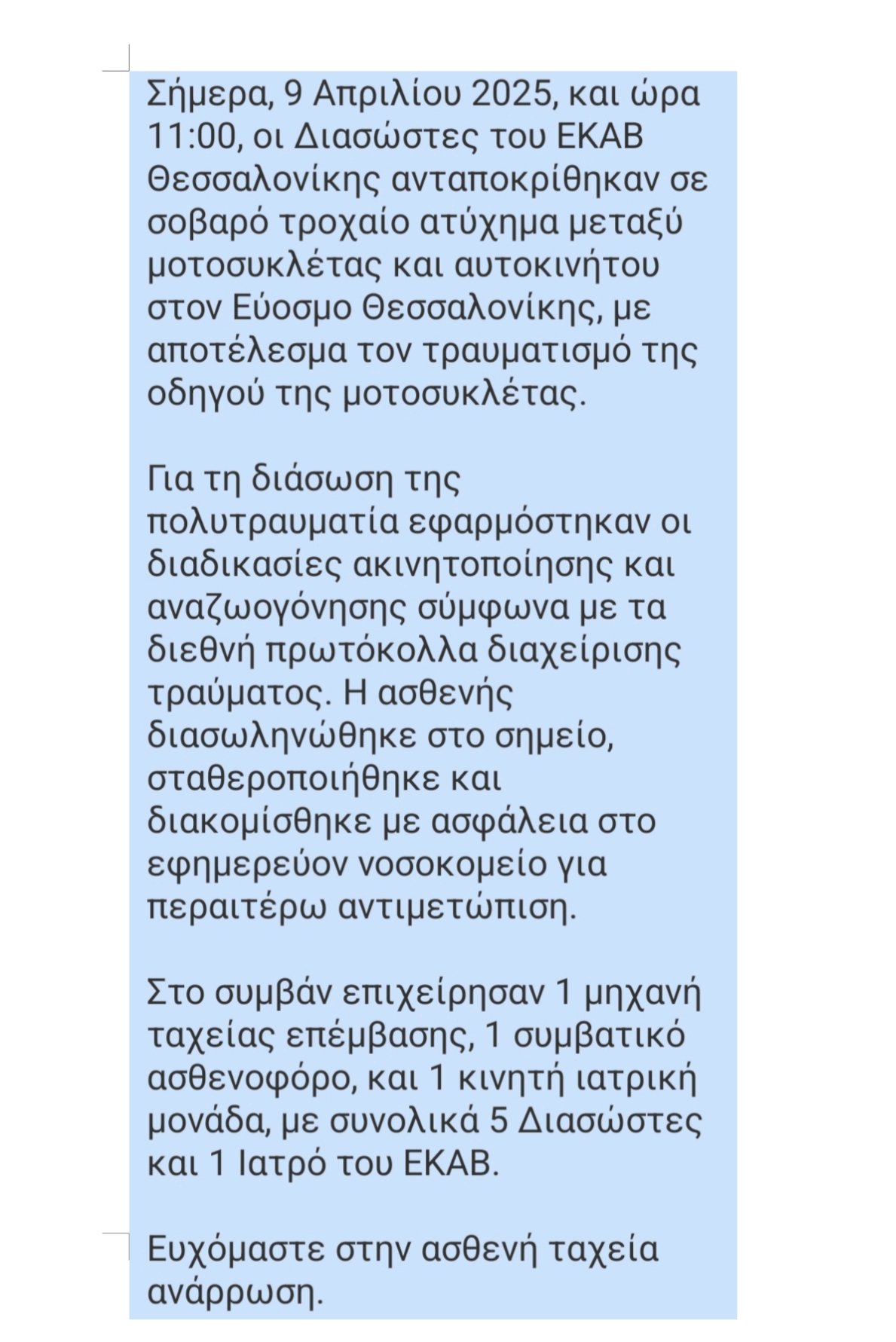 Στο σημείο έφτασαν διασώστες του ΕΚΑΒ που προχώρησαν στην επί τόπου διασωλήνωση της οδηγού της μοτοσικλέτας.