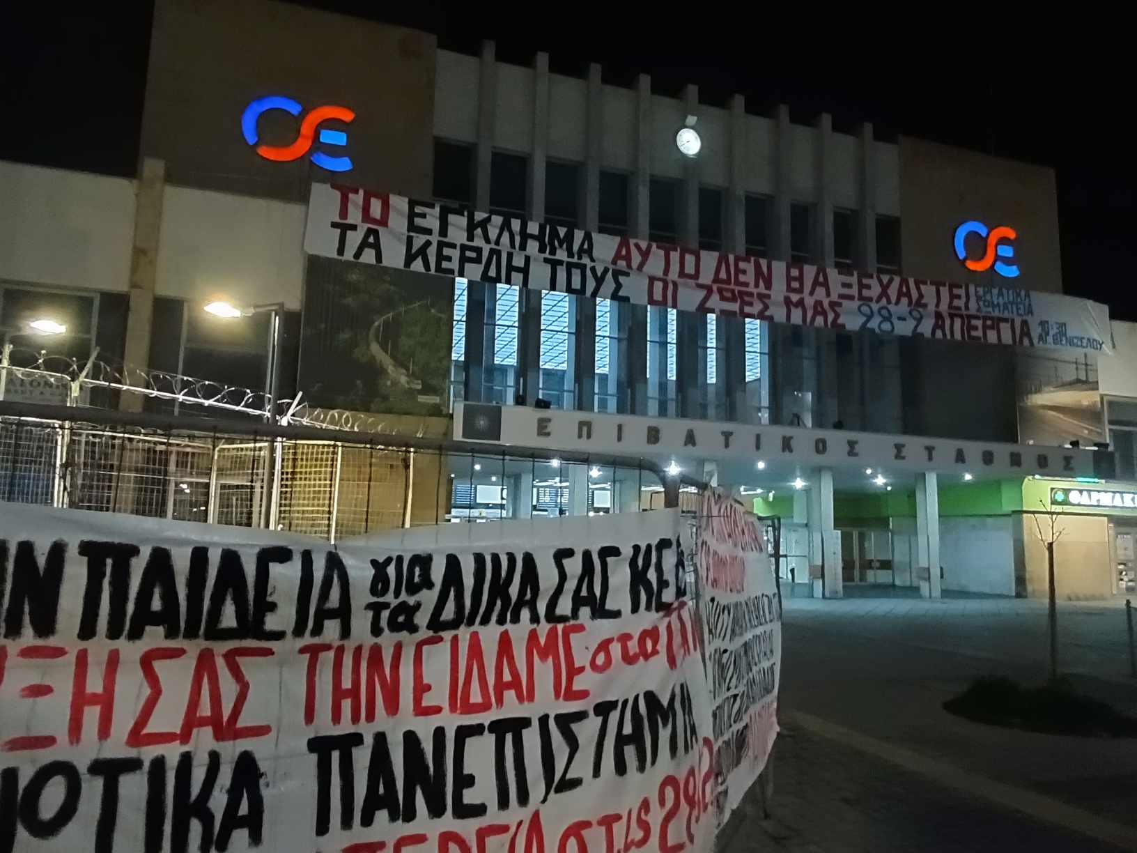 Κινητοποίηση πραγματοποίησαν εργαζόμενοι το απόγευμα της Πέμπτης (22.02.2024) στην Θεσσαλονίκη, έξω από τον ΟΣΕ, ενώ ανήρτησαν στο κτήριο πανό για τα Τέμπη.