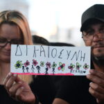 Ανάμεσα στο συγκεντρωμένο πλήθος βρίσκονται και συγγενείς θυμάτων, ενώ άτομα κρατούν πανό, ζητώντας δικαιοσύνη για τους 57 αδικοχαμένους ανθρώπους και τις οικογένειές τους.