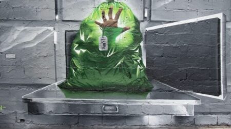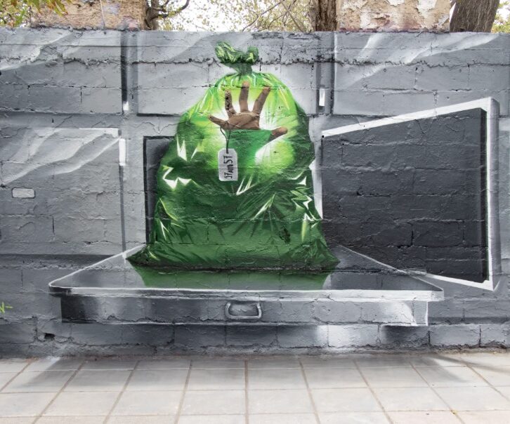 “Το έργο απεικονίζει το νεκροτομείο στο οποίο τοποθετήθηκαν σε πράσινες σφραγισμένες σακούλες οι απανθρακωμένες σωροί των θυμάτων. Το χέρι που πασχίζει να βγει από τη σακούλα συμβολίζει την προσπάθεια των νεκρών να ‘μιλήσουν’ και να αφηγηθούν την τραγική ιστορία τους μέσα από τα στοιχεία που θα προκύψουν από τις βιοχημικές εξετάσεις ενώ η σακούλα έχει πέραν της πραγματικής υπόστασής της, συμβολίζει επίσης τους περιορισμούς τίθενται και την προσπάθεια συγκάλυψης από το σύστημα. Το νούμερο 17 στο ταμπελάκι είναι ο αύξοντας αριθμός του Ντάνιελ στη λίστα των 57 θυμάτων” αναφέρεται σχετικά από την πλευρά του καλλιτέχνη.