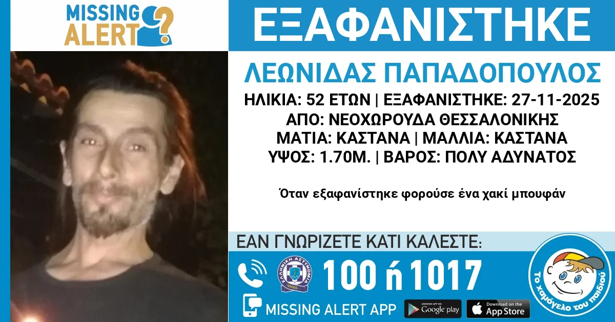 Συγκεκριμένα, σύμφωνα με την ανακοίνωση που εξέδωσε το Χαμόγελο του Παιδιού, στις 27/11/2025, απογευματινές ώρες, εξαφανίστηκε από την περιοχή της Νεοχωρούδας Θεσσαλονίκης, ο Παπαδόπουλος Λεωνίδας, 52 ετών. Το Χαμόγελο του Παιδιού ενημερώθηκε για την εξαφάνισή του σήμερα 02/12/2025 και άμεσα προχώρησε στη δημοσιοποίηση των στοιχείων του ενήλικου, κατόπιν αιτήματος των οικείων του, καθώς ενδεχομένως συντρέχουν λόγοι που θέτουν την ζωή του σε κίνδυνο.