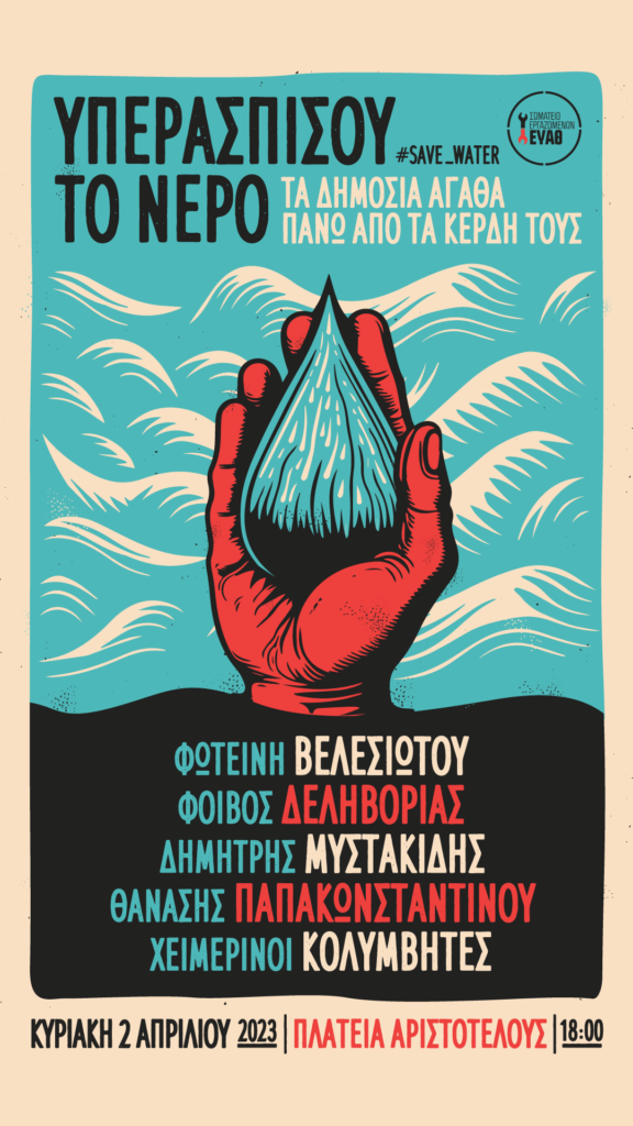 Υπερασπιζόμαστε τον δημόσιο χαρακτήρα του νερού χωρίς αυξήσεις στα τιμολόγια, διεκδικώντας την έξοδο των ΕΥΔΑΠ και ΕΥΑΘ από το Υπερταμείο, την άμεση εφαρμογή των αποφάσεων του ΣτΕ και την απόσυρση του νομοσχεδίου για τη δημιουργία της Ρυθμιστικής Αρχής Αποβλήτων, Ενέργειας και Υδάτων.