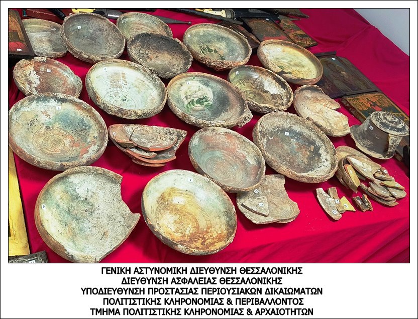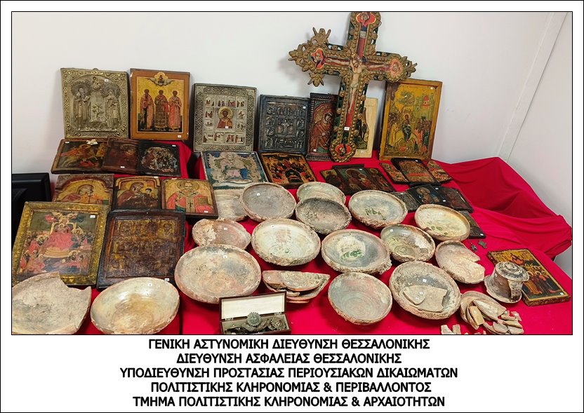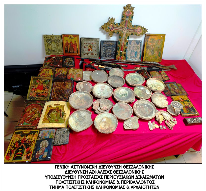 - (1) κεραμικό αντικείμενο αρχαίων χρόνων, (52) κεραμικά, εκ των οποίων τα 10 κεραμικά χρονολογούνται στα αρχαία χρόνια (Ελληνιστική περίοδος 4ος αι π.χ.), 42 κεραμικά αντικείμενα που χρονολογούνται πριν το 1453 στη Βυζαντινή περίοδο, τα οποία θεωρούνται ιδιαίτερης αρχαιολογικής και οικονομικής αξίας, (24) θρησκευτικές εικόνες, (1) σταυρός τέμπλου μεταβυζαντινών χρόνων και (2) μεταλλικοί σταυροί, τα οποία σύμφωνα με γνωμάτευση αρμόδιας αρχαιολόγου της Εφορείας Αρχαιοτήτων Θεσσαλονίκης εμπίπτουν στις προστατευτικές διατάξεις του Νόμου που αφορά σε «Κύρωση κώδικα νομοθεσίας για την προστασία των αρχαιοτήτων και εν γένει της πολιτιστικής κληρονομιάς»,