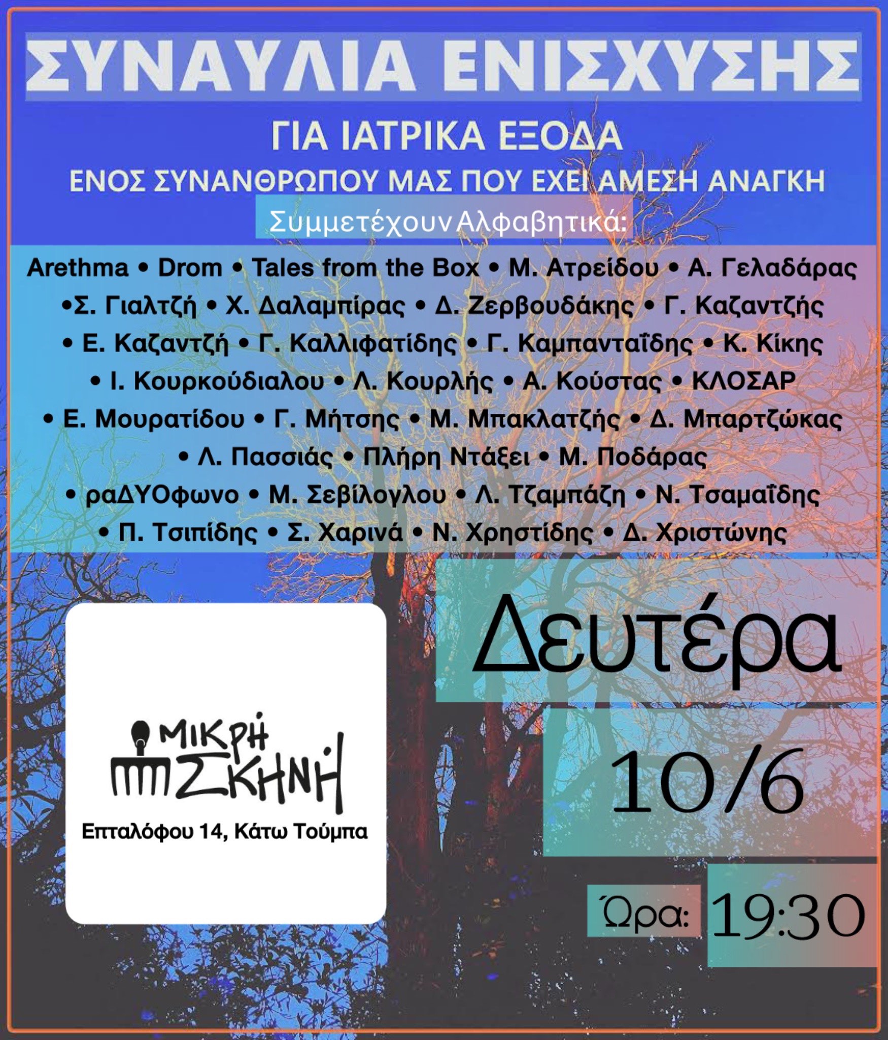 Συναυλία κάλυψης ιατρικών αναγκών για έναν συνάνθρωπο μας σε ανάγκη, διοργανώνεται την ερχόμενη Δευτέρα (10/6) στη Μικρή Σκηνή.