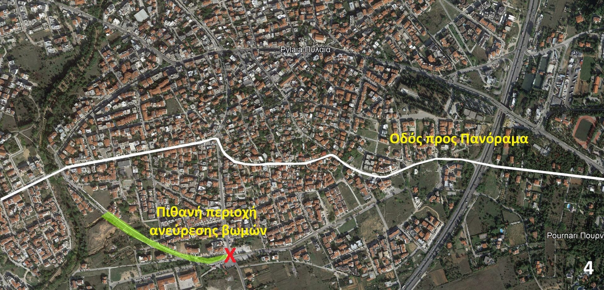 Η ταύτιση της περιοχής ανεύρεσης των βωμών βασίζεται στις τοπογραφικές πληροφορίες που μας δίνουν η αναφορά της αστυνομίας, το άρθρο του Γουγούση και ο άγγλος επιγραφολόγος M. N. Tod, σε συνδυασμό με ένα σκίτσο-χάρτη του γάλλου αρχαιολόγου L. Rey, σύγχρονο της εύρεσης των βωμών. Από τον χάρτη αυτόν έχουμε τη χάραξη του δρόμου, ο οποίος ήταν τότε το νότιο όριο του οικισμού της Πυλαίας και υπάρχει μέχρι σήμερα στην πορεία των οδών Βεργίνας-Μ. Αλεξάνδρου-Πρασακάκη, μέχρι τη συμβολή του με την οδό Πυλαίας-Πανοράματος (Τζων Κέννεντυ), στο ύψος του κολλεγίου «Ανατόλια».
