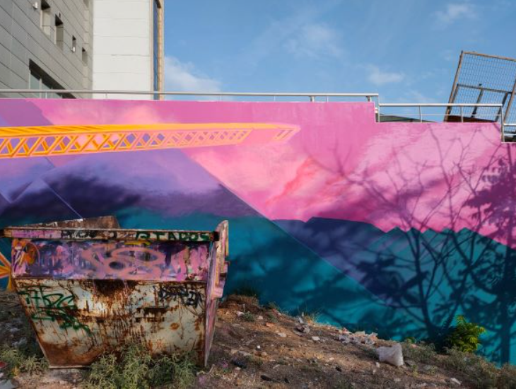 Τοπίο με γραμμές κτιρίων, γερανών οι οποίες εκτείνονται σε μήκος περίπου 10 μέτρων και ύψος μέχρι και τέσσερα μέτρα, μια αίσθηση προοπτικής, πολυπλοκότητα στις αλληλοεπικαλύψεις των στοιχείων της “πόλης” που δημιουργήθηκε, είναι τα κύρια στοιχεία του νέου graffiti της Θεσσαλονίκης που ολοκληρώθηκαν μέσα πέντε περίπου μήνες, με το τελικό αποτέλεσμα «να δίνει χρώμα και “ταξίδια” του ματιού που έχουμε ανάγκη, ταξίδια σε άλλους κόσμους, μακριά από αυτόν του γκρίζου μιας πόλης…», καταλήγει ο graffiti mural των 35 μέτρων.