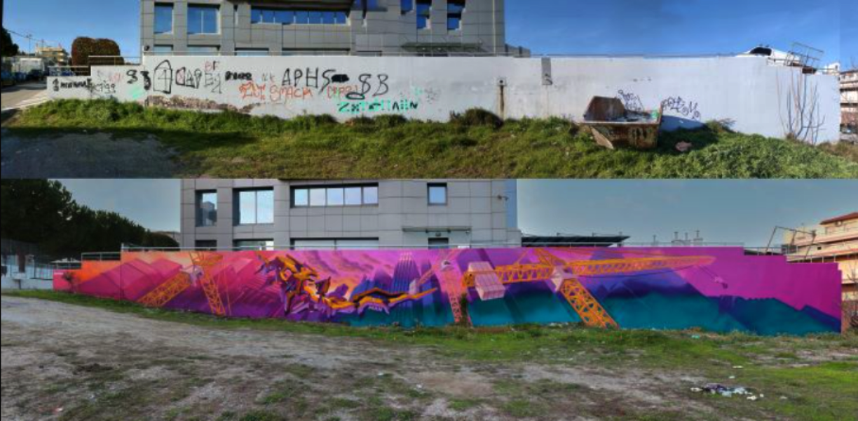 Ο ειδικός στα graffiti ανέλαβε την μεταμόρφωση του τοίχου στο τέλος της περασμένης άνοιξης και εργάστηκε εκατοντάδες ώρες μέχρι να ολοκληρωθεί το «…τοπίο από μια φανταστική, πολύχρωμη πόλη, τεχνολογικά εξελιγμένη» μόλις τον περασμένο Νοέμβριο, όπως ο ίδιος ανέφερε μιλώντας στον ραδιοφωνικό σταθμό του ΑΠΕ ΜΠΕ, «Πρακτορείο 104.9FM».