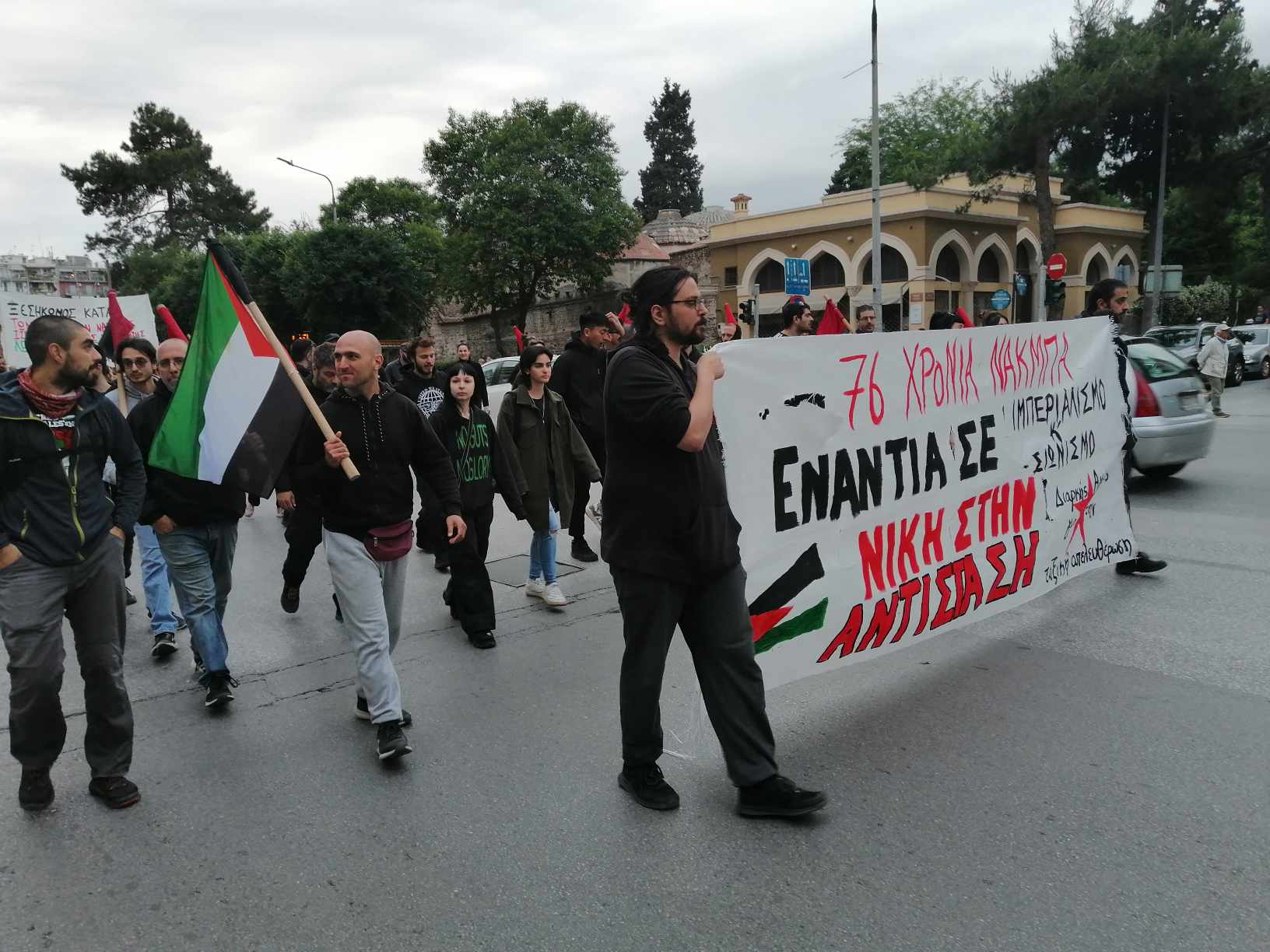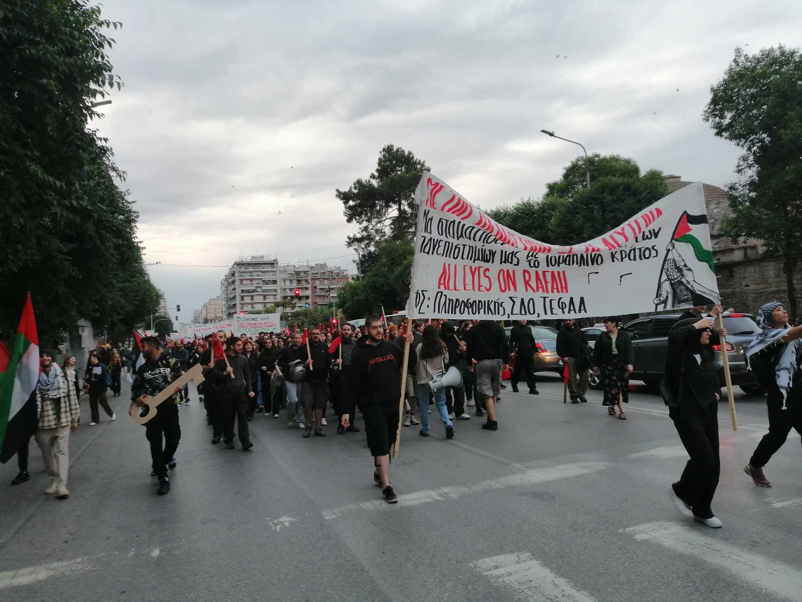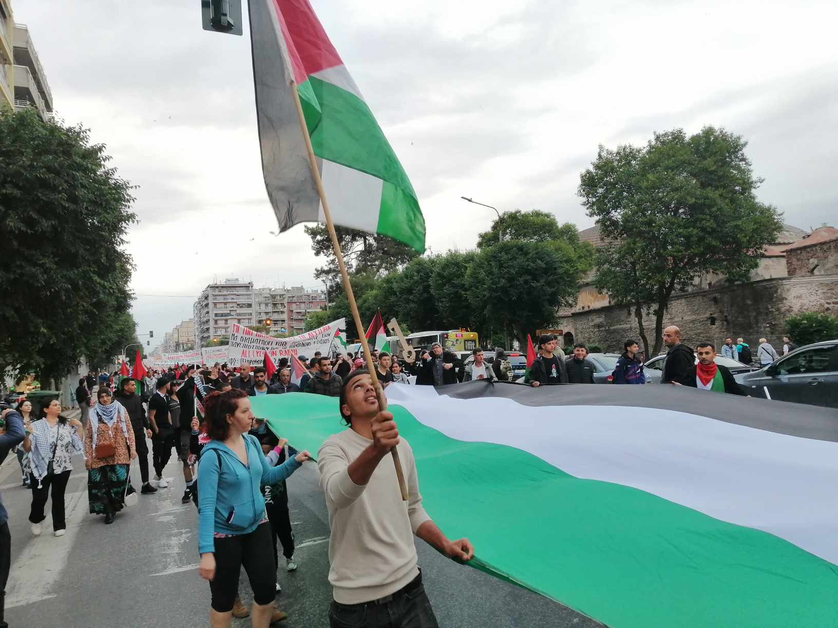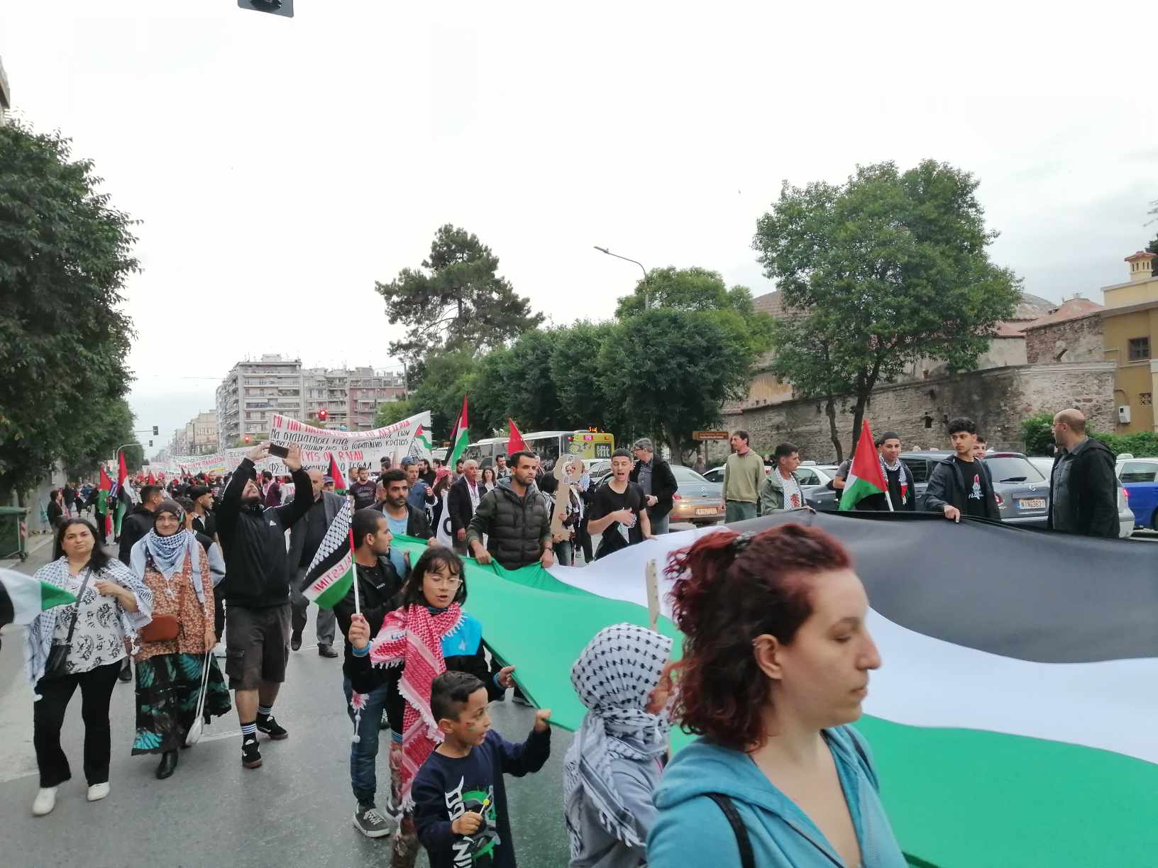 Πορεία στο κέντρο της Θεσσαλονίκης εξελίσσεται αυτή τη στιγμή ως ένδειξη αλληλεγγύης υπέρ του Παλαιστινιακού λαού. Η πορεία ξεκίνησε από το άγαλμα του Βενιζέλου επί της Εγνατίας ενώ έπειτα κατέβηκε από την Αγίας Σοφίας προς την Τσιμισκή και αναμένεται να καταλήξει στο Υπουργείο Μακεδονίας – Θράκης. Παρούσα στην πορεία είναι και η αστυνομία.