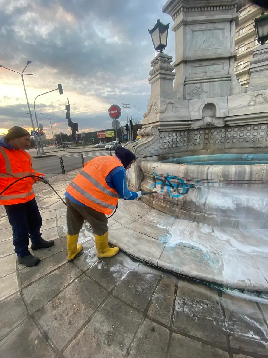 Συνεργείο της υπηρεσίας Καθαριότητας του δήμου Θεσσαλονίκης καθάρισε άμεσα τα αναγραφόμενα συνθήματα.