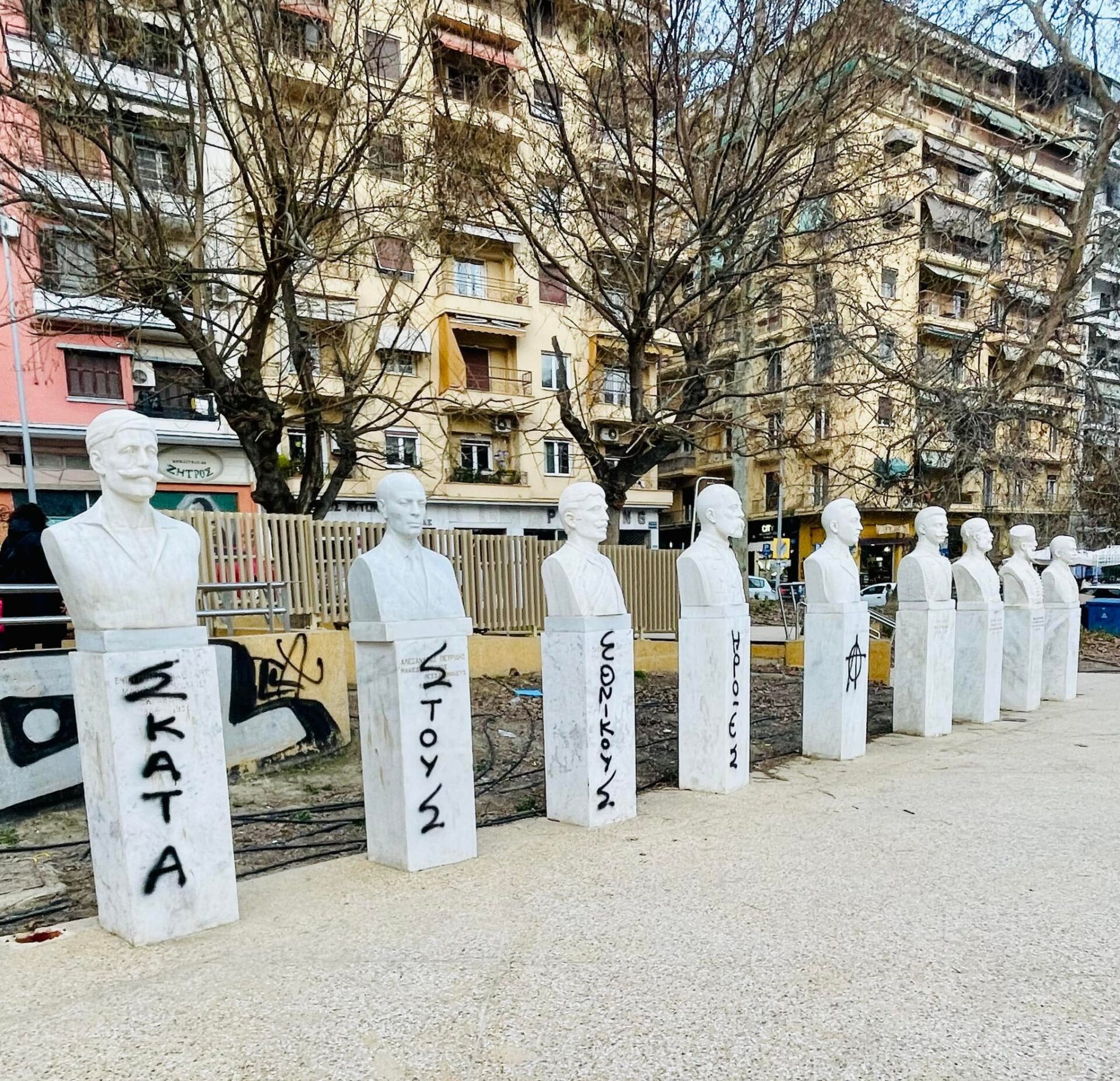 Εικόνες ντροπής στις προτομές των Μακεδονομάχων στην ομώνυμη πλατεία στο κέντρο της Θεσσαλονίκης.
