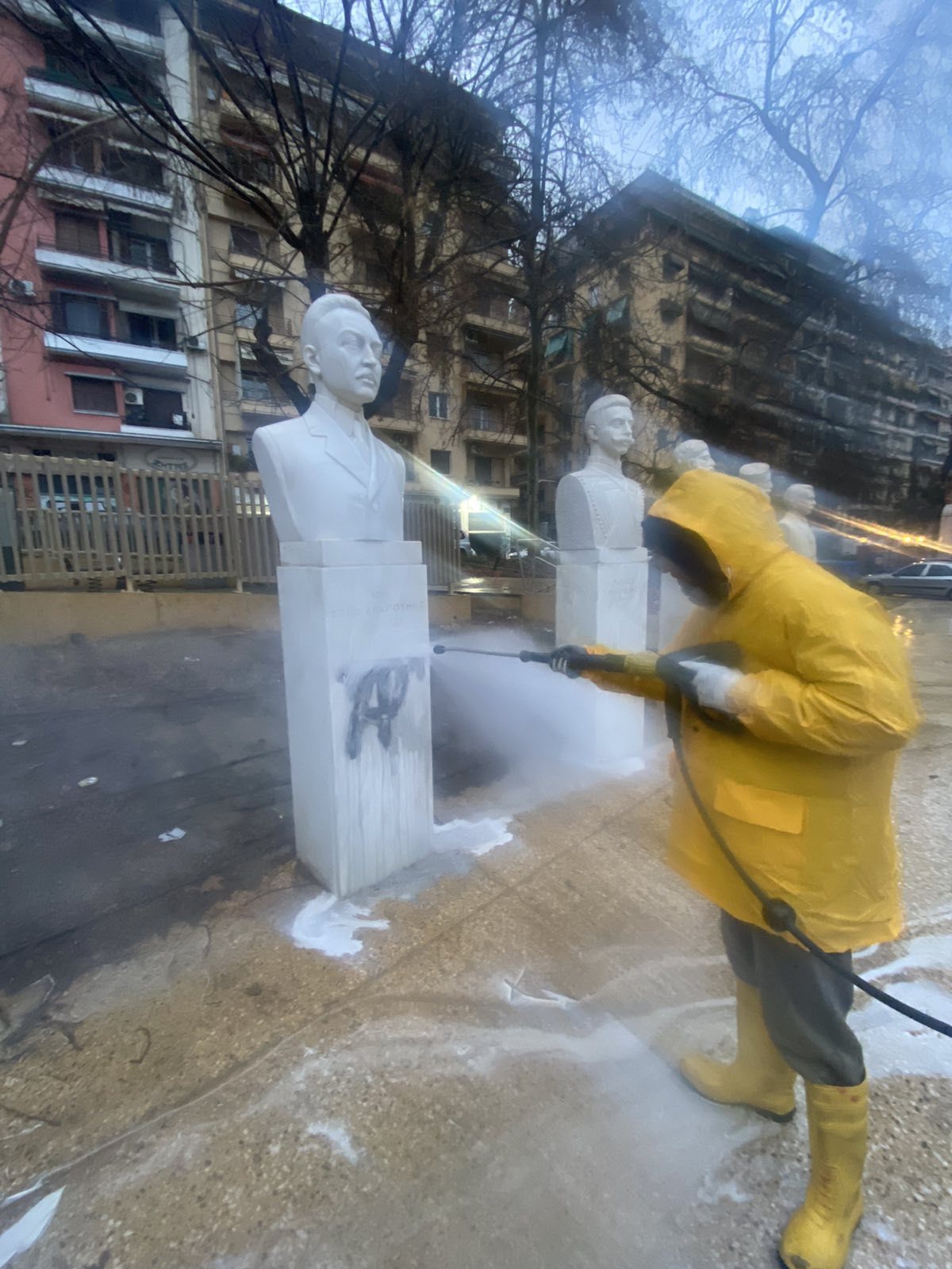 Άμεση ήταν η επέμβαση της υπηρεσίας καθαριότητας του Δήμου Θεσσαλονίκης που προχώρησε σε καθαρισμό των προτομών, ώστε να επανέλθουν στην μέχρι πρότινος κατάστασή τους.