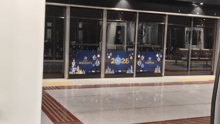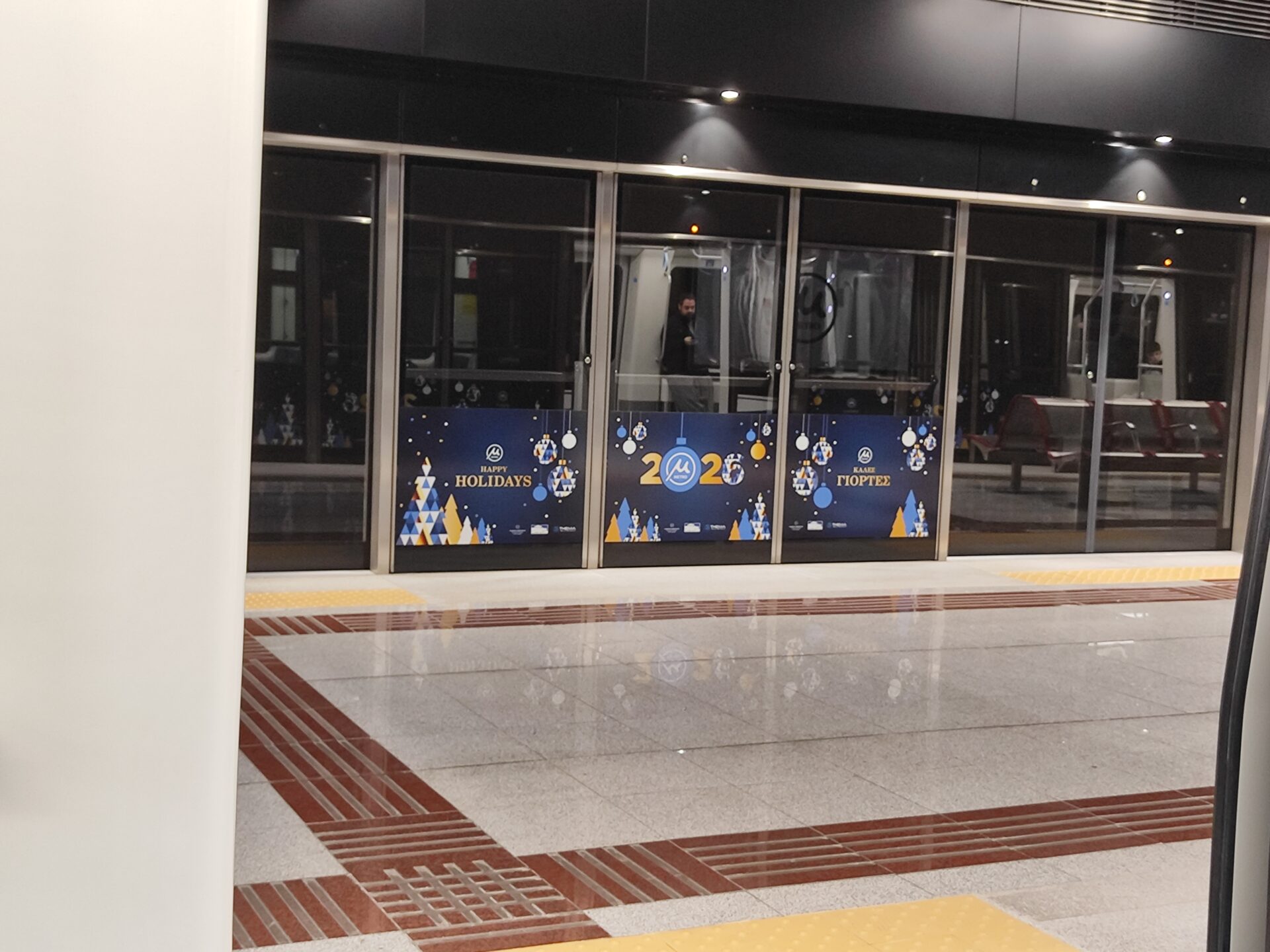 Στο… πνεύμα των ημερών, οι αποβάθρες έχουν «στολιστεί» με εορταστικό μήνυμα που εύχεται στους επιβάτες καλές γιορτές και ευτυχισμένο το 2026.