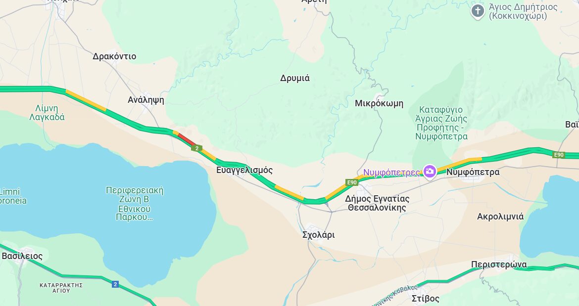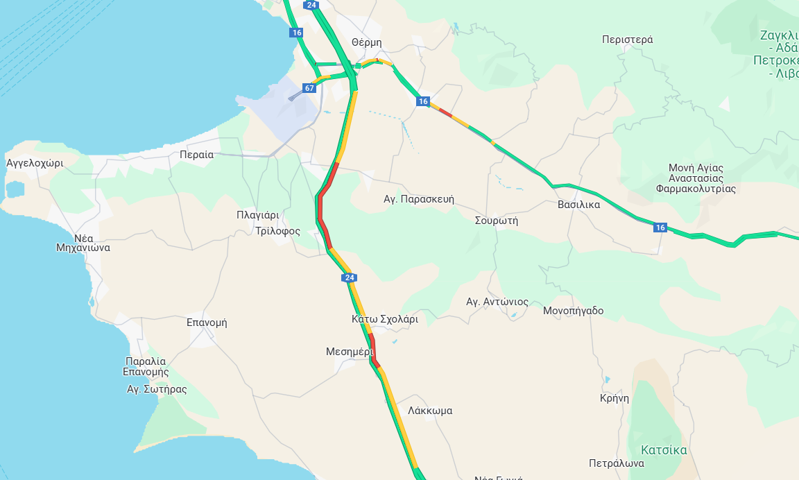 Στην Εθνική Οδό Θεσσαλονίκης–Πολυγύρου, η επιστροφή εξελίσσεται ομαλά, με καθυστερήσεις μόνο σε σημεία με φανάρια, όπως στα Βασιλικά και τη Νέα Ραιδεστό.