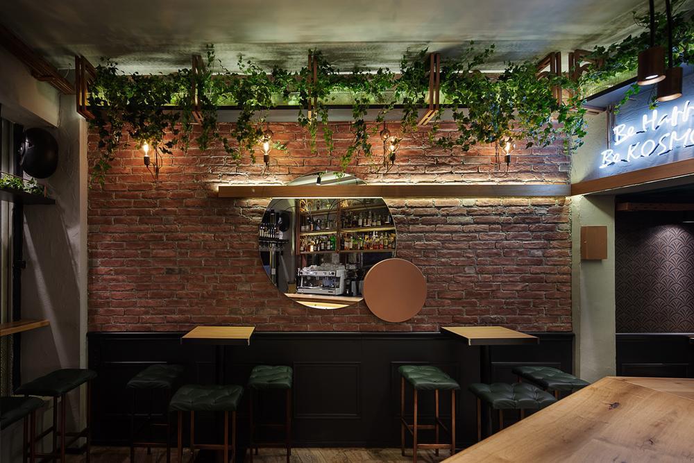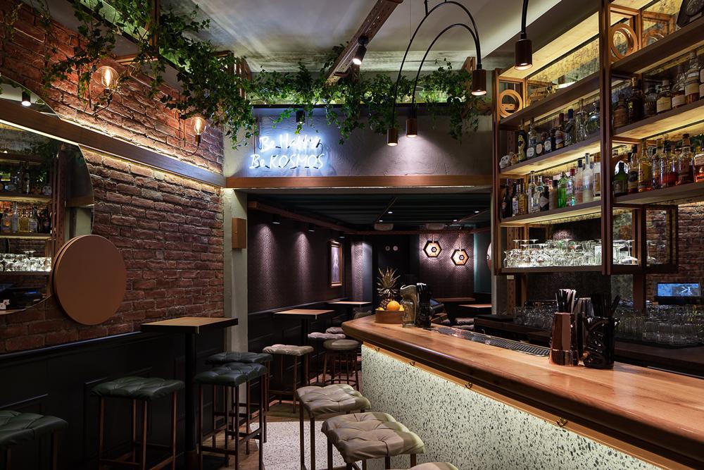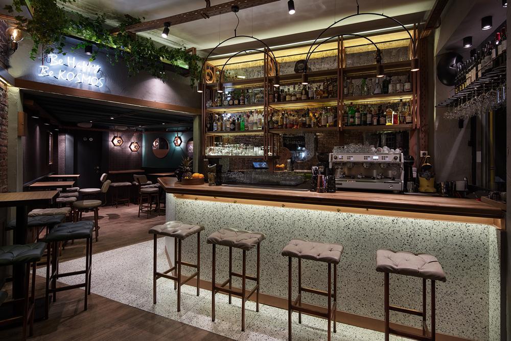 «Το KOSMOS είναι ένα μοντέρνο cafe-bar το οποίο λειτουργεί εφτά ημέρες την εβδομάδα. Τα πρωινά με καφέ (ελληνικό, Φραπέ, Freddo κτλ) και ελληνικές πίτες. Τα βράδια λειτουργεί ως μπαρ. Παρασκευή και Σάββατο βράδυ λειτουργούμε έως αργά με διάφορα πάρτυ (ξένα ή ελληνικά). Σερβίρουμε επίσης πολλά ελληνικά ποτά και μπύρες. Σχεδόν ο μισός αριθμός των πελατών μας είναι Έλληνες. Είναι ένα στέκι το μαγαζί για πολλούς ανθρώπους εδώ. Έρχονται μόνοι τους και ξέρουν πως θα βρουν κάποιον. Οι εργαζόμενοι είναι κυρίως Έλληνες».