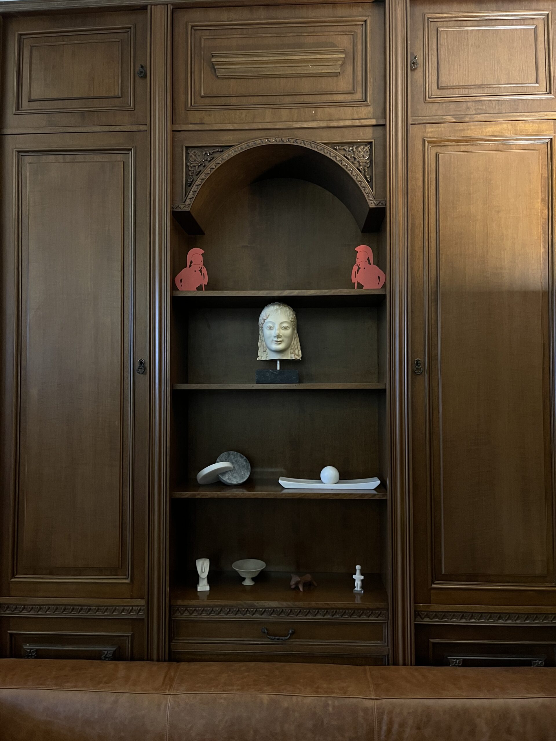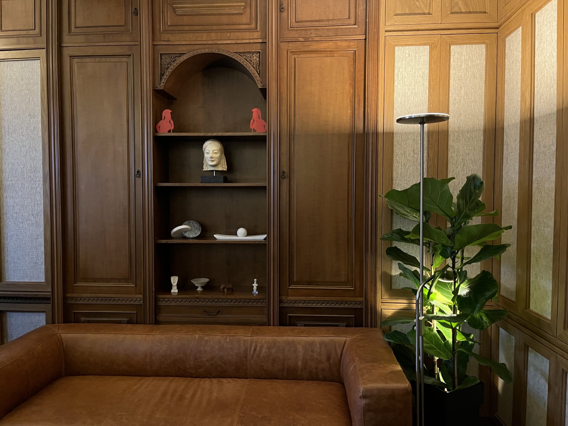 Η παλιά βιβλιοθήκη με λίγες νέες καινούργιες προσθήκες, σε συνδυασμό με τον καφέ δερμάτινο καναπέ, τα σύγχρονα και μοντέρνα στοιχεία διακόσμησης, δίνουν μία μοναδική πνοή στον χώρο, ο οποίος είναι ιδανικά φτιαγμένος για meetings, με το τεράστιο ξύλινο τραπέζι και τη μεγάλη οθόνη δίπλα από τα παράθυρα που «λούζουν» με φως τον χώρο.