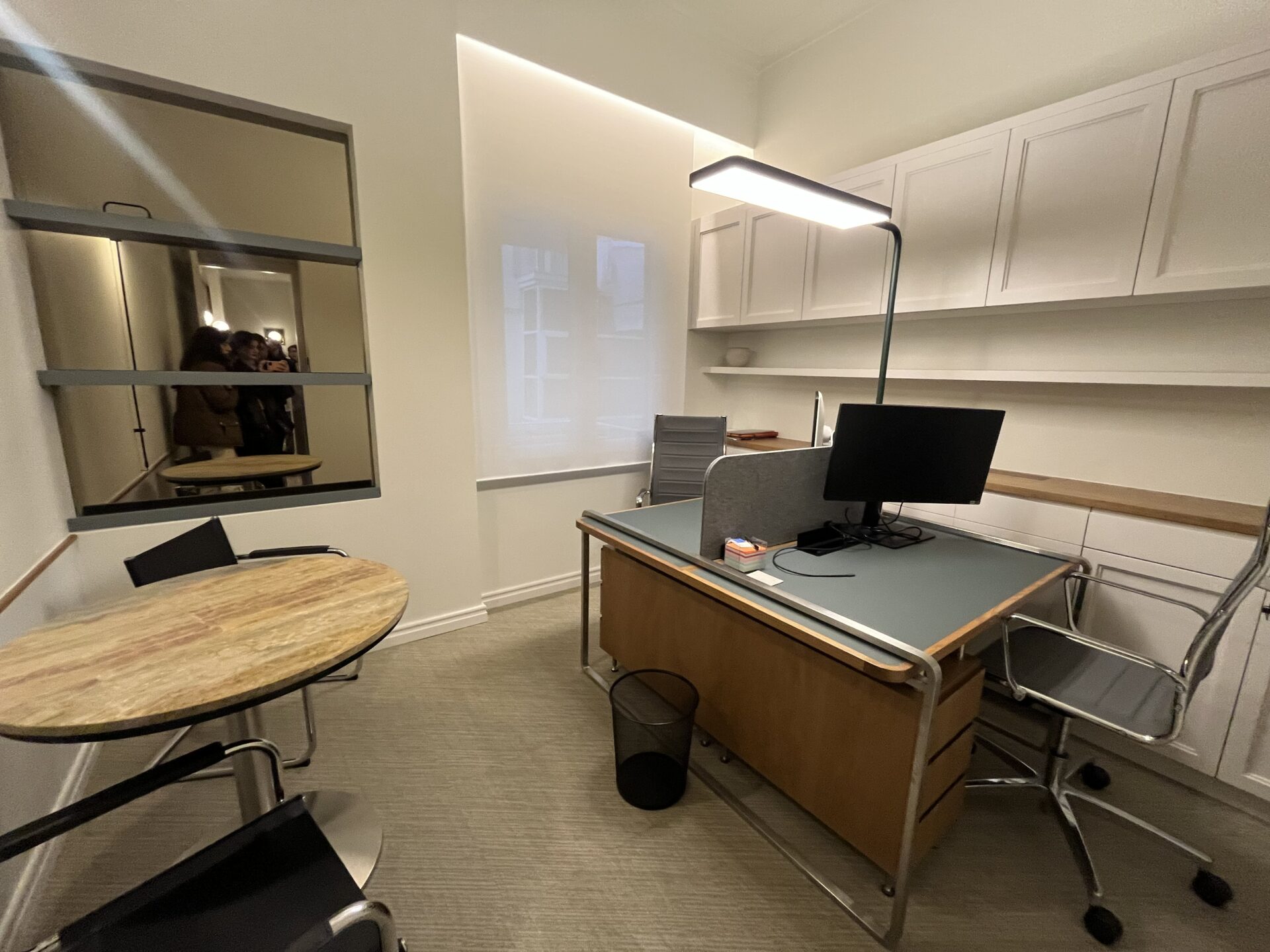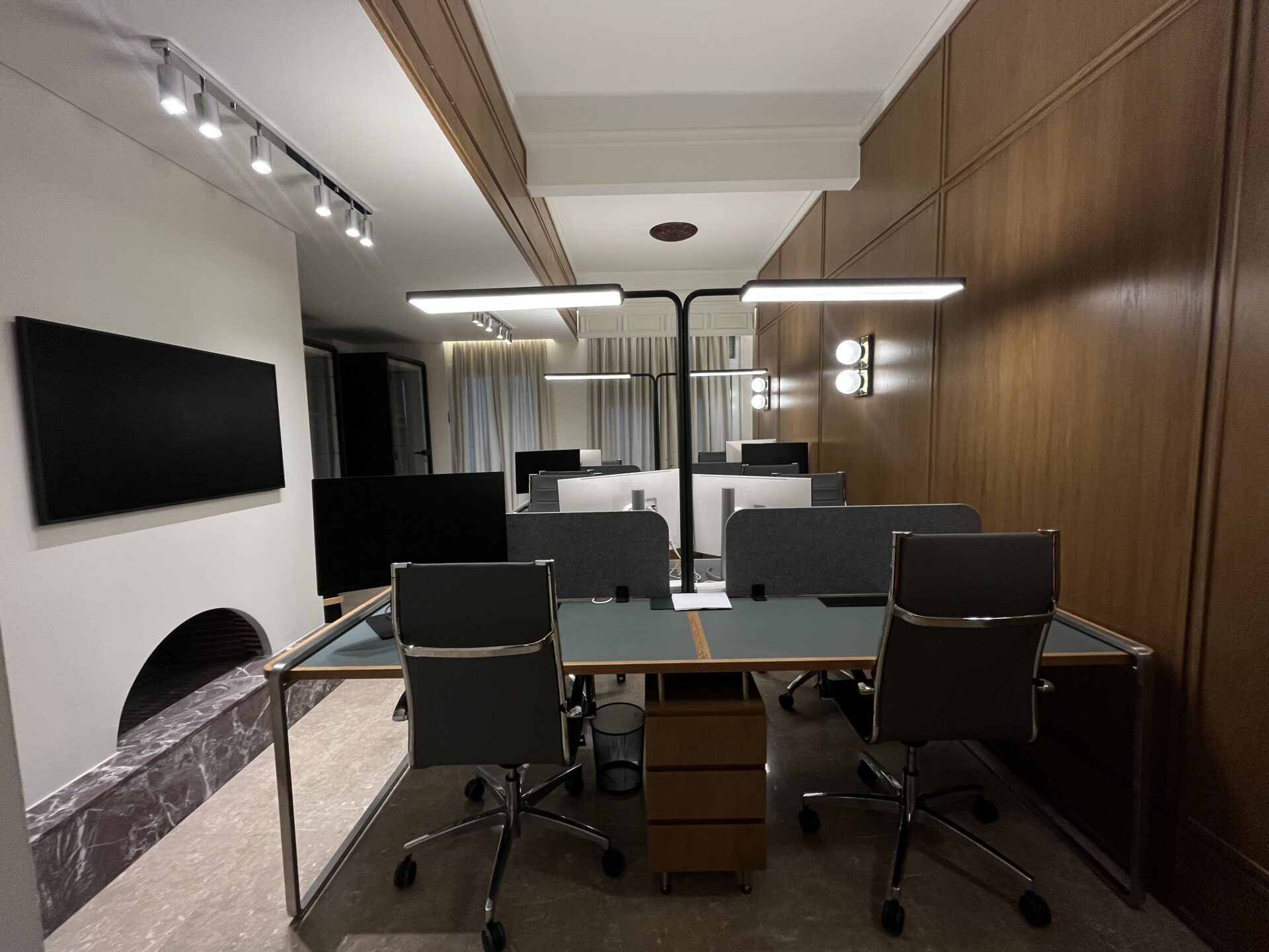 Εκεί, το ξύλινο στοιχείο παραμένει και το βλέμμα σου δεν μπορεί παρά να πέσει στους θαλάμους – τα ειδικά booths με ηχομόνωση που έχουν δημιουργηθεί έτσι ώστε οι εργαζόμενοι να μπορούν να εισέλθουν οποιαδήποτε ώρα και στιγμή της ημέρας για να κάνουν τις κλήσεις τους ή σε στιγμές που τα τηλέφωνα δεν σταματούν να χτυπούν, για την καλύτερη συγκέντρωσή τους.