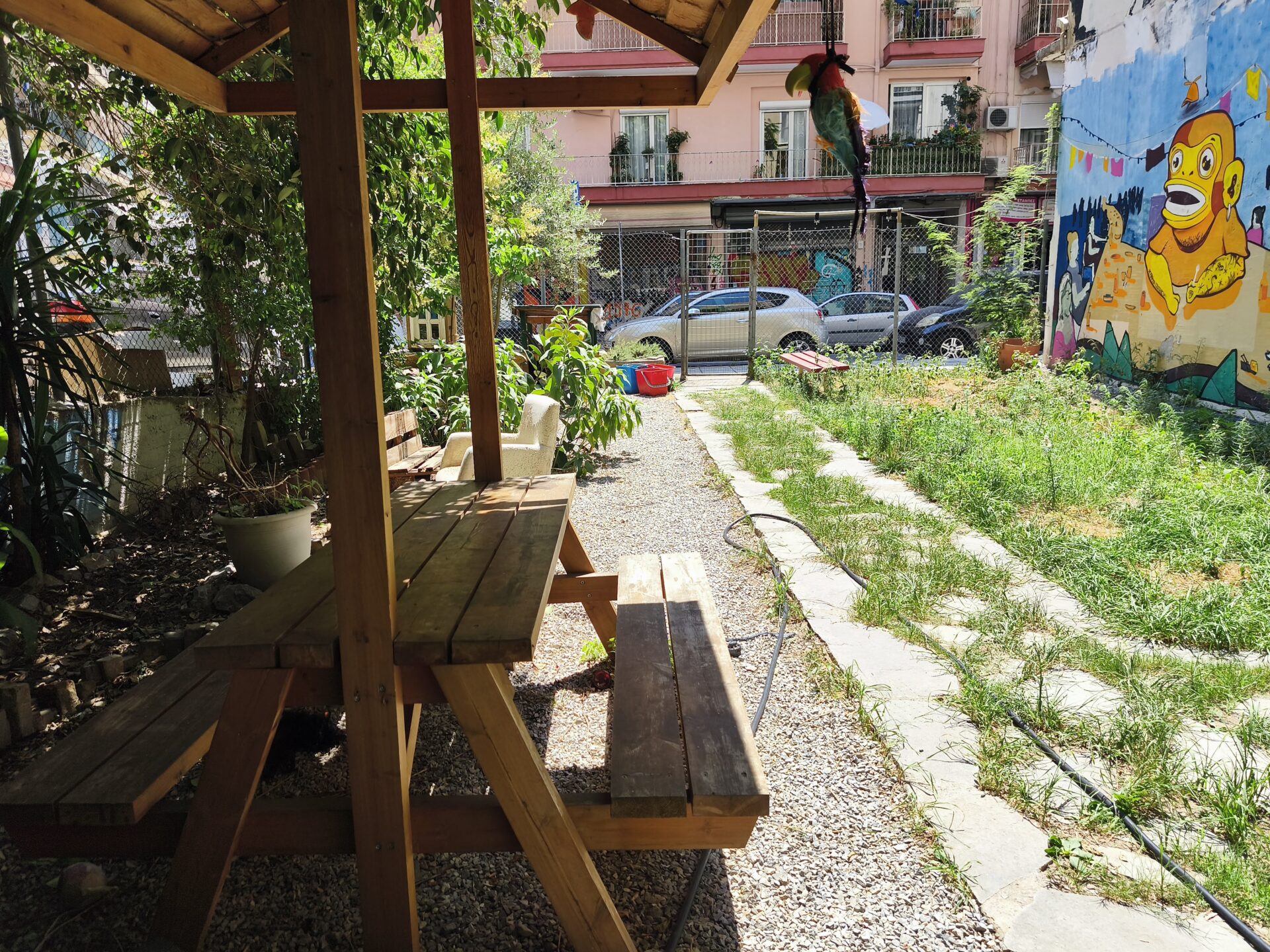 Στο οικόπεδο έγινε εκτεταμένος καθαρισμός, αποψιλώθηκαν τα αγριόχορτα και στρώθηκαν πλάκες. Σταδιακά, καρέκλες, τραπέζια και γλάστρες με φυτά δημιούργησαν μικρά «καθιστικά» εντός της έκτασης, ενώ οι συμμετέχοντες στο εγχείρημα έφτιαξαν και ένα χτιστό, στεγασμένο μπαρ. Σε επόμενη φάση, street artists της πόλης χρωμάτισαν με έργα τους τις τυφλές όψεις των πολυκατοικιών που περιβάλλουν το οικόπεδο.