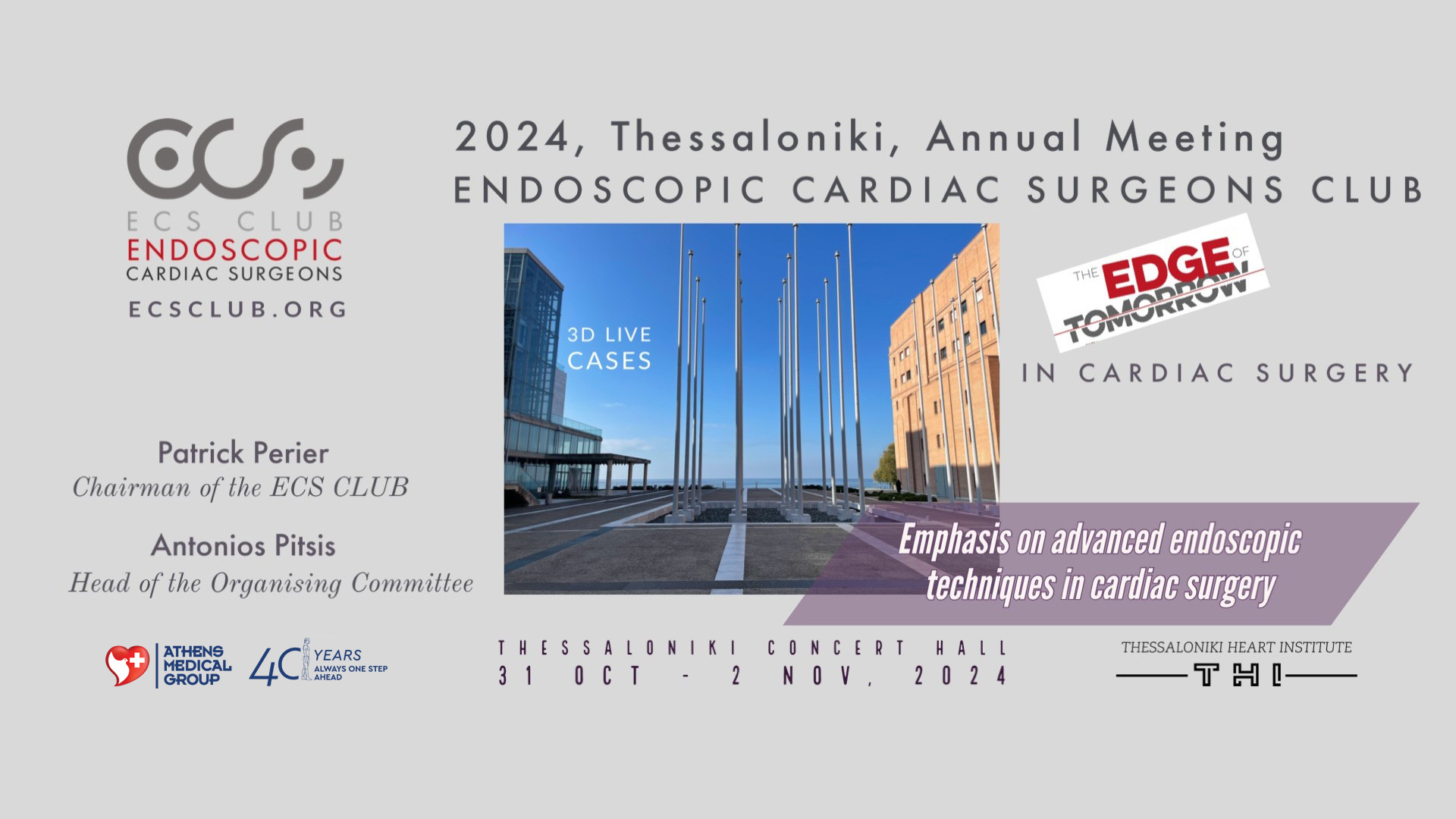 Μετά την απόλυτα επιτυχημένη παγκόσμια συνάντηση στο Μιλάνο, η Θεσσαλονίκη ετοιμάζεται να υποδεχτεί το Endoscopic Cardiac Surgeons Club για την τρίτη ετήσια διεθνή συνάντησή του από τις 31 Οκτωβρίου έως τις 2 Νοεμβρίου 2024, στο Μέγαρο Μουσικής (κτίριο Μ2). Πρόκειται για ένα παγκόσμιο γεγονός που αναμένεται να προσελκύσει το έντονο ενδιαφέρον της διεθνούς επιστημονικής κοινότητας, με στόχο την προώθηση καινοτόμων τεχνικών και πρωτοποριακών πρακτικών στην ενδοσκοπική καρδιοχειρουργική.