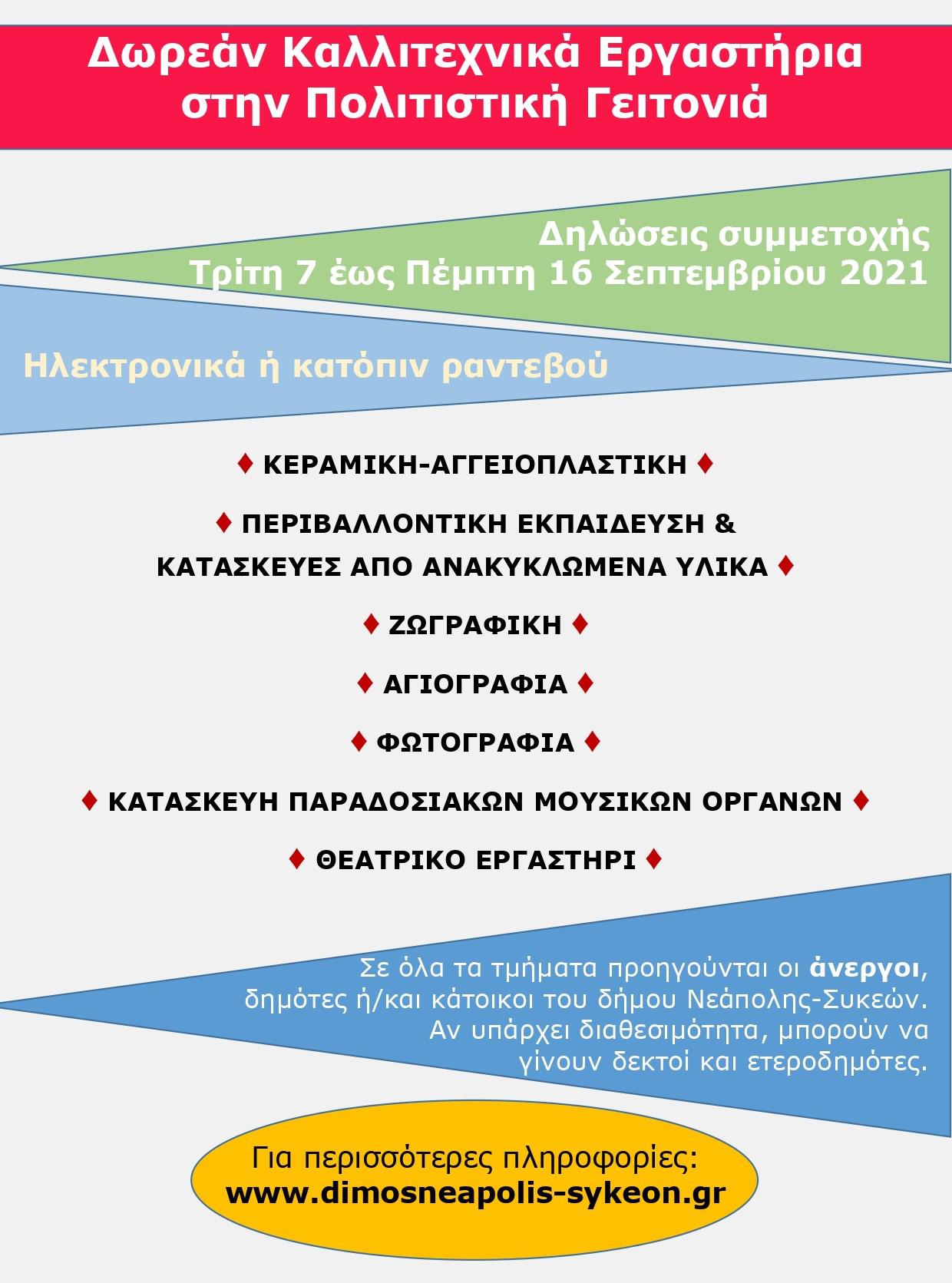 Κεραμική- αγγειοπλαστική, περιβαλλοντική εκπαίδευση και κατασκευές από ανακυκλωμένα υλικά, ζωγραφική, αγιογραφία, φωτογραφία, κατασκευή παραδοσιακών μουσικών οργάνων αλλά και Θέατρο θα έχουν την ευκαιρία να διδαχθούν εντελώς δωρεάν, άνεργοι ενήλικες, δημότες-κάτοικοι του δήμου Νεάπολης – Συκεών (αν υπάρχει διαθεσιμότητα μπορούν να γίνουν δεκτοί και ετεροδημότες), στον νέο κύκλο εργαστηριακών μαθημάτων που ξεκινούν στην Πολιτιστική Γειτονιά στη Δ.Ε. Συκεών.