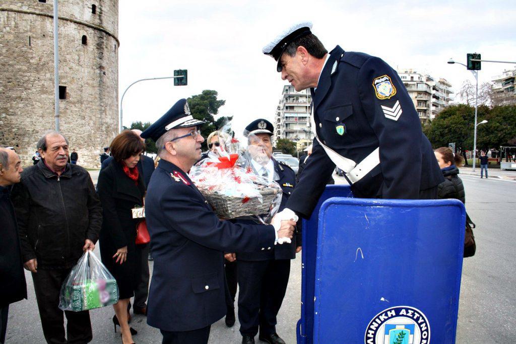 Ο Γενικός Αστυνομικός Διευθυντής Θεσσαλονίκης, Υποστράτηγος Φώτιος Δομζαρίδης αντάλλαξε ευχές και προσέφερε εθιμοτυπικά δώρα στο ρυθμιστή τροχονόμο της Διεύθυνσης Τροχαίας Θεσσαλονίκης.