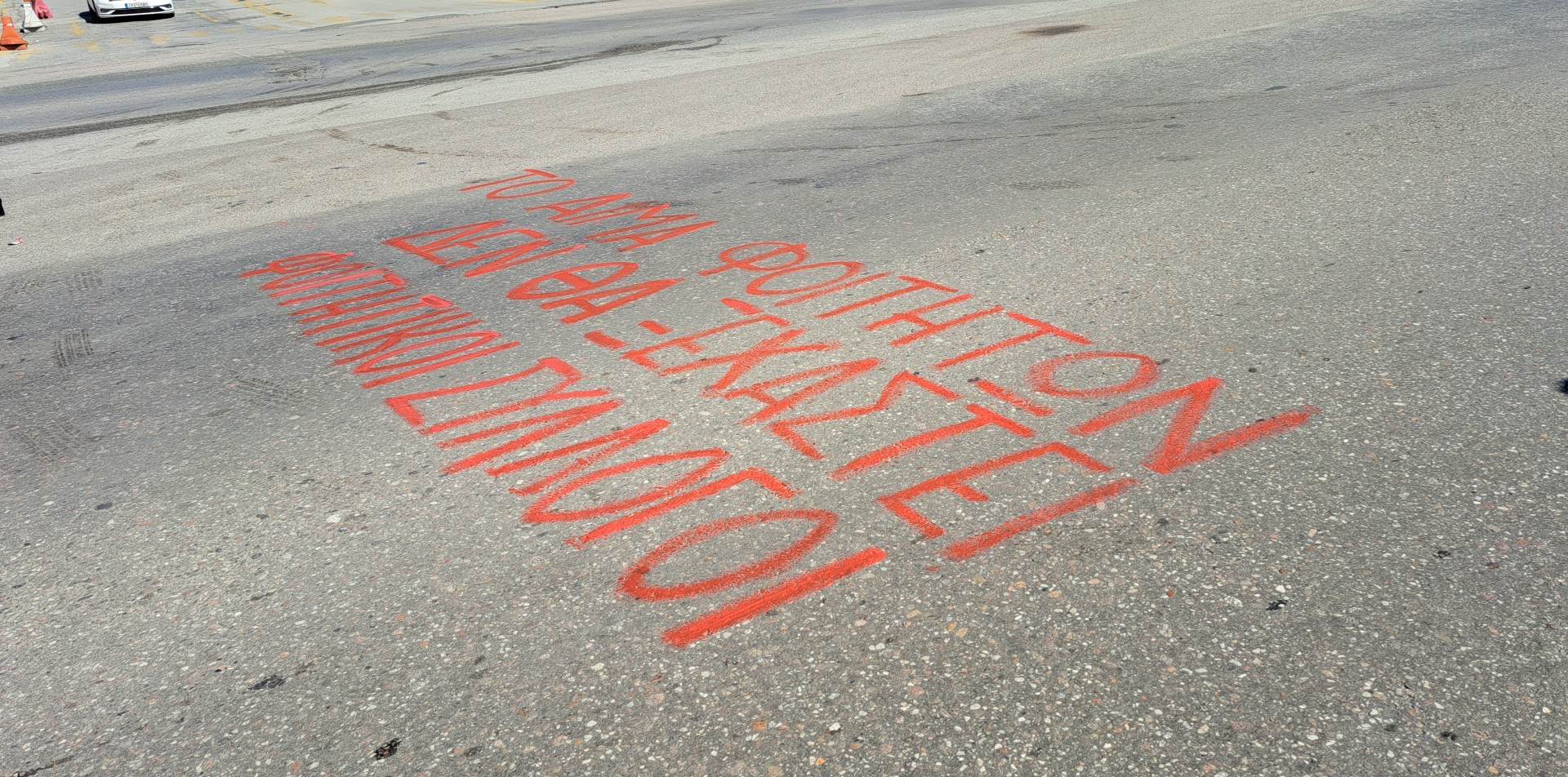 «Το αίμα των φοιτητών δεν θα ξεχαστεί» έγραψαν στην άσφαλτο φοιτητές έξω από το κτίριο τελετών του ΑΠΘ.
