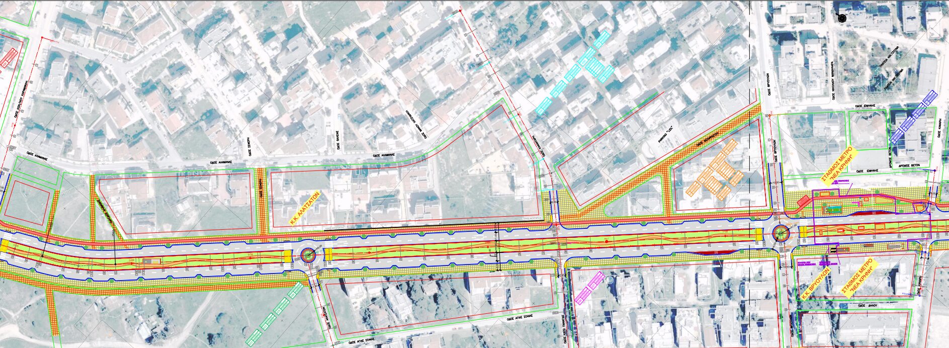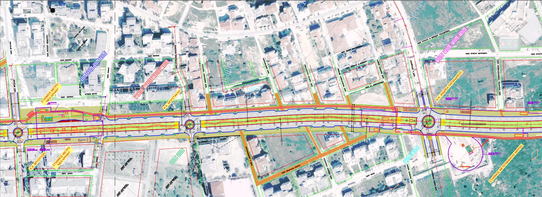 Η νησίδα θα διακόπτεται στις διασταυρώσεις της οδού με τις κάθετες οδούς Αγ. Νικολάου, Κ. Καραμανλή, Αλατσατών, Βρυούλων Σ. Μουστακλή και Α. Παπανδρέου, όπου προβλέπεται να διαμορφωθούν έξι (6) νέοι κυκλικοί κόμβοι, χωρίς φωτεινούς σηματοδότες και χωρίς αριστερές στροφές.