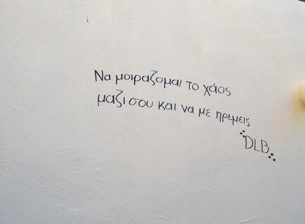 Πίσω από το πάρκο Στέργιου Πολυδώρου, σε ένα μικρό στενό θα δεις το παρακάτω. Λείπουν οι τόνοι, αλλά το νόημα της φράσης θα μπορούσες να το αφιερώσεις στον εκλεκτό ή την εκλεκτή σου: