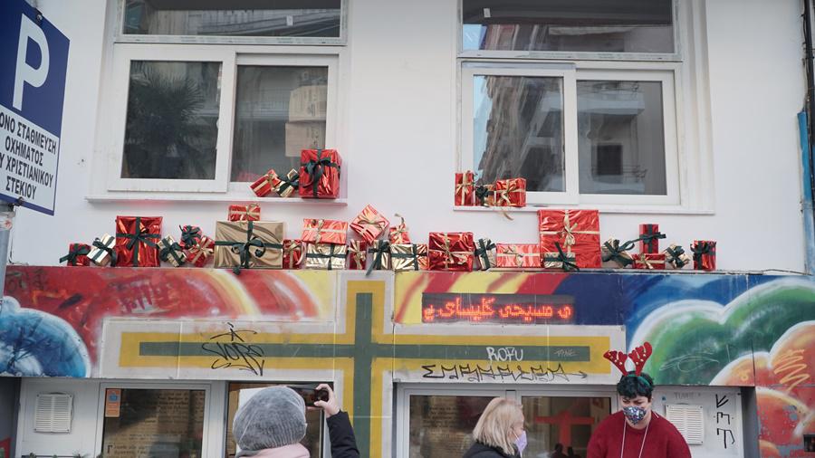 Την παραμονή των Χριστουγέννων, το πολύχρωμο κτήριο του αριθμού 10 της πλατείας Ιπποδρομίου φώτισε σαν γιορτινή όαση στο κέντρο της πόλης. Το Χριστιανικό Στέκι που μετρά φέτος 44 χρόνια εθελοντικής προσφοράς στους αστέγους και απόρους της Θεσσαλονίκης, γέμισε μουσική, χαμόγελα κρυμμένα από μάσκες και αγιοβασιλιάτικα σκουφιά.