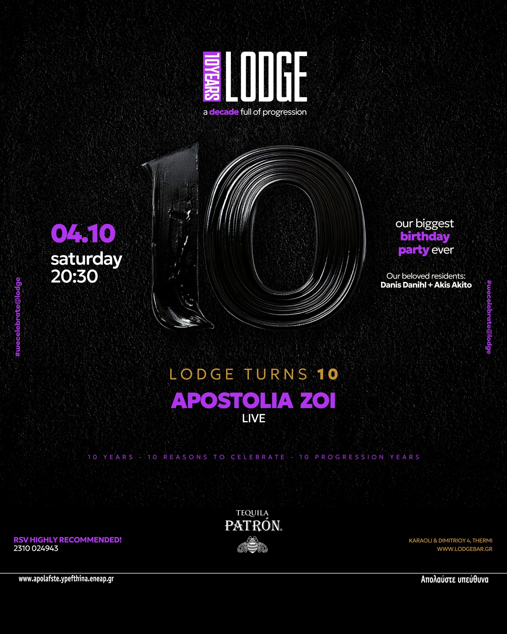 Γιορτάστε μαζί μας τα 10 χρόνια του Lodge! Μια δεκαετία μουσικής, φίλων και αξέχαστων βραδιών και γιορτάζουμε με το μεγαλύτερο πάρτι γενεθλίων που έγινε ποτέ. Apostolia Zoi ζωντανά στη σκηνή Οι αγαπημένοι μας resident DJs: Danis Danihl & Akis Akito Το Σάββατο, 04.10 μετά τις 20:30 Καραολή & Δημητρίου 4, Θέρμη RSVP Συνιστάται: 2310 024943 Ελάτε μαζί μας για μια βραδιά γεμάτη ενέργεια, μουσική και αναμνήσεις που θα μείνουν αξέχαστες.