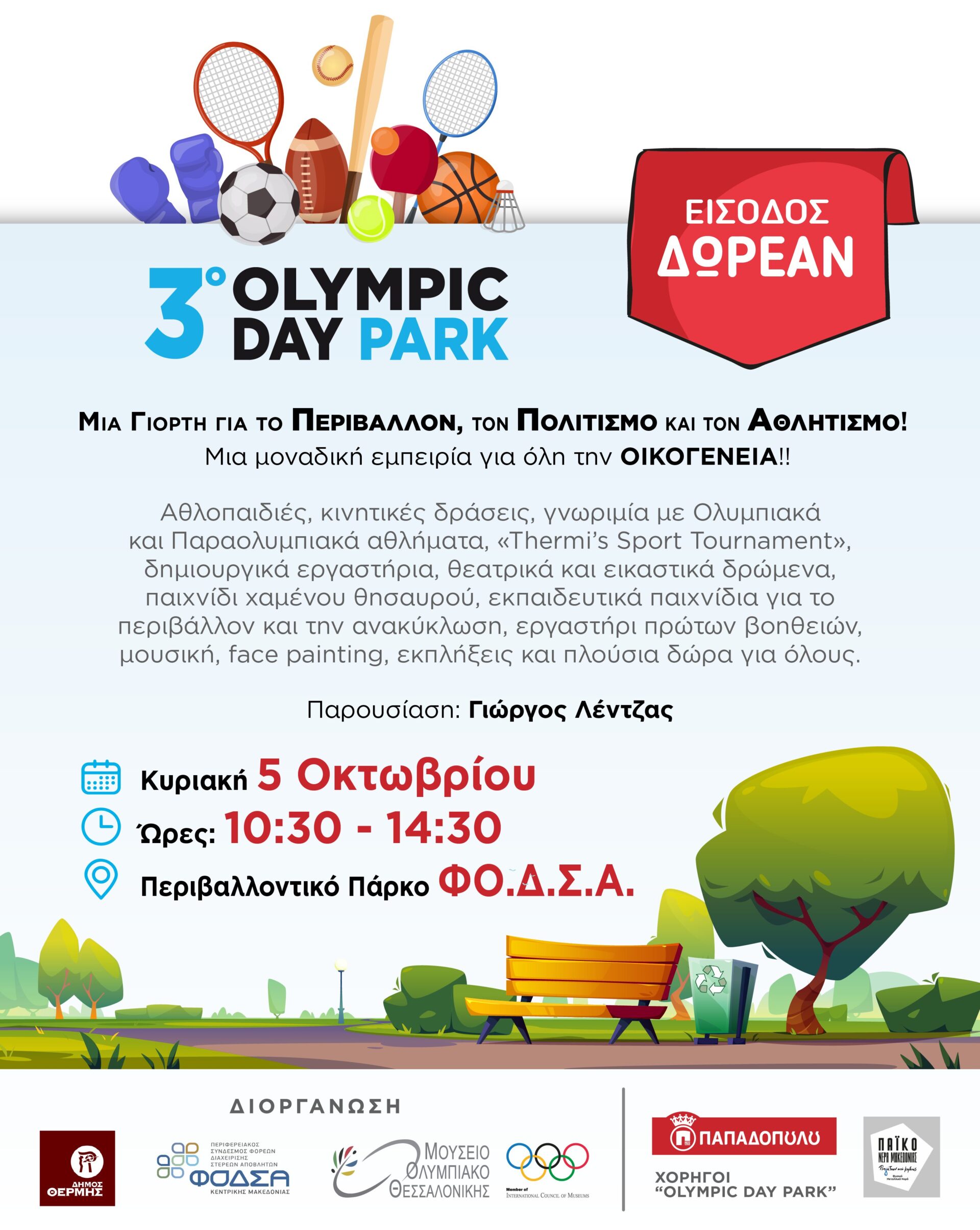 Το 3ο “Olympic Day” Park 2025 διοργανώνεται από το Ολυμπιακό Μουσείο, τον Δήμο Θέρμης και τον Φορέα Διαχείρισης Στερεών Αποβλήτων Κεντρικής Μακεδονίας (ΦΟ.Δ.Σ.Α.), με την υποστήριξη της εταιρείας Παπαδοπούλου, Χορηγό του 3ου “Olympic Day” Park, στο πλαίσιο του εορτασμού της Διεθνούς Ολυμπιακής Ημέρας (“Olympic Day”) 2025 και του “Olympic Day Run” Greece.