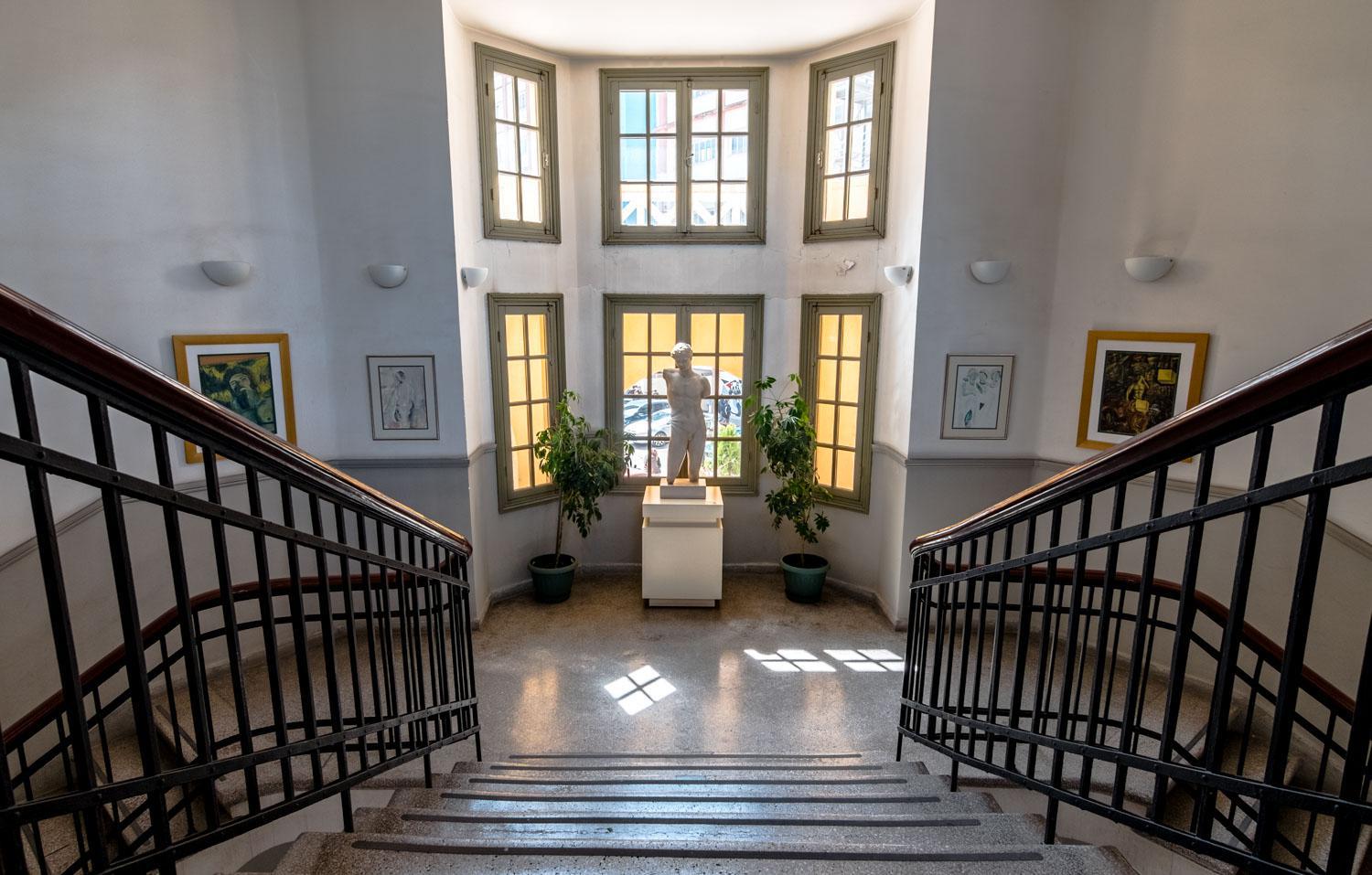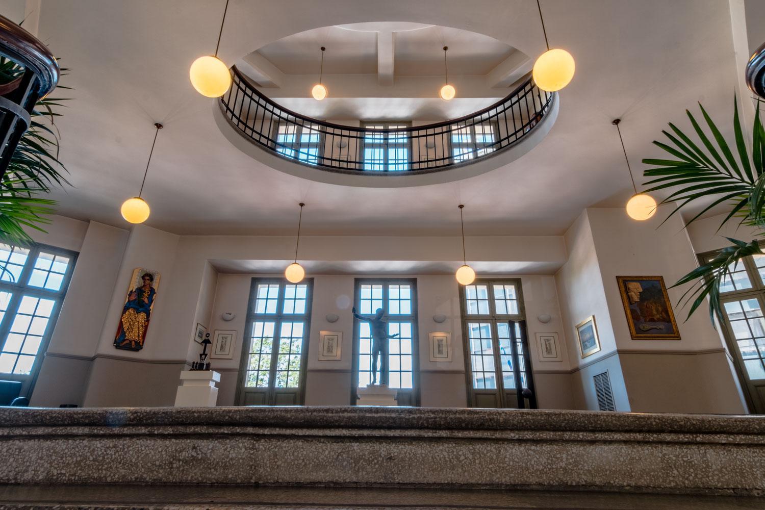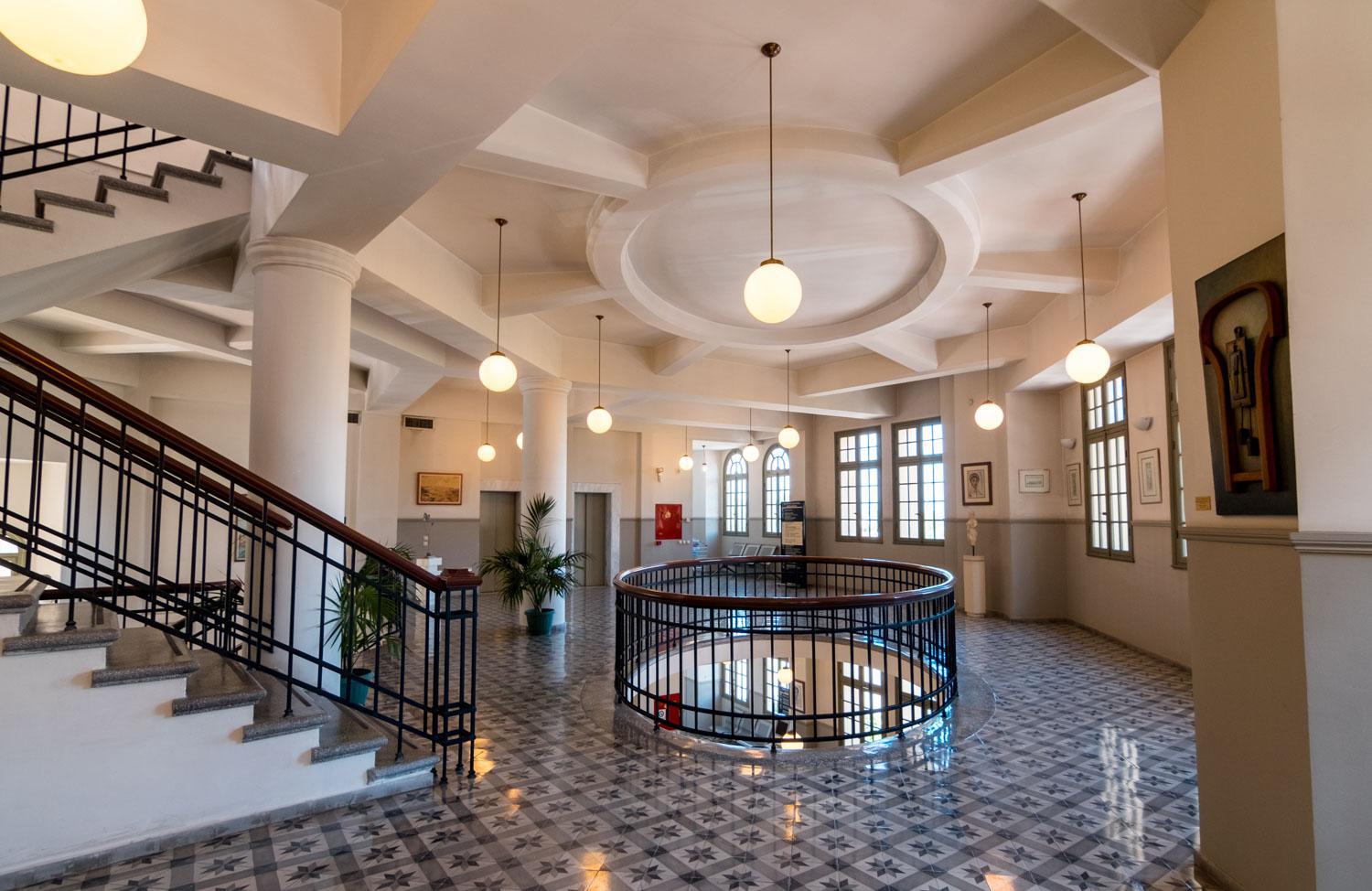 Ο εσωτερικός διάκοσμος του κτιρίου είναι απλός ενώ εντυπωσιάζουν οι σκάλες που οδηγούν στους ορόφους.