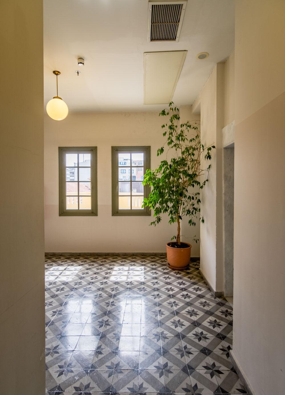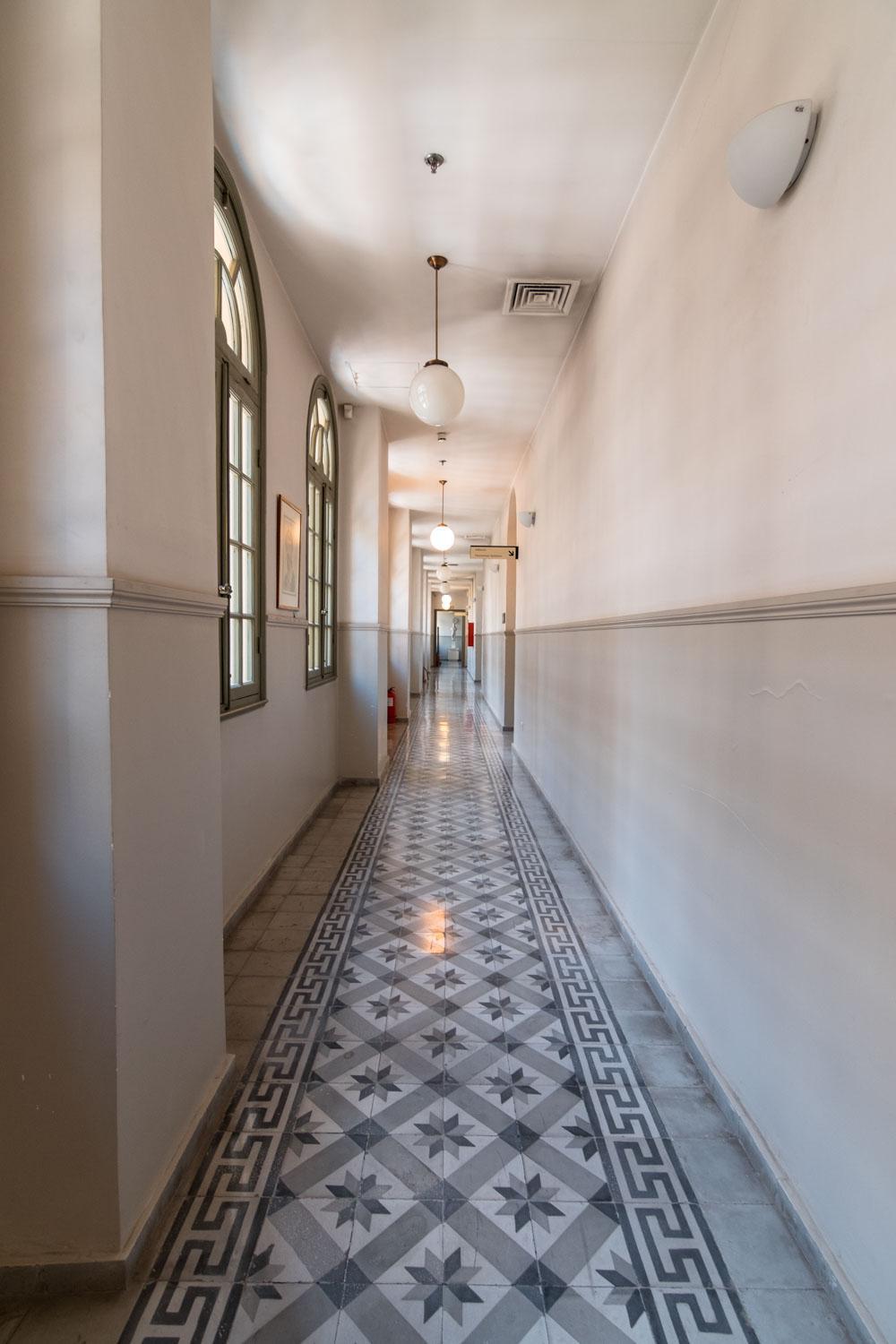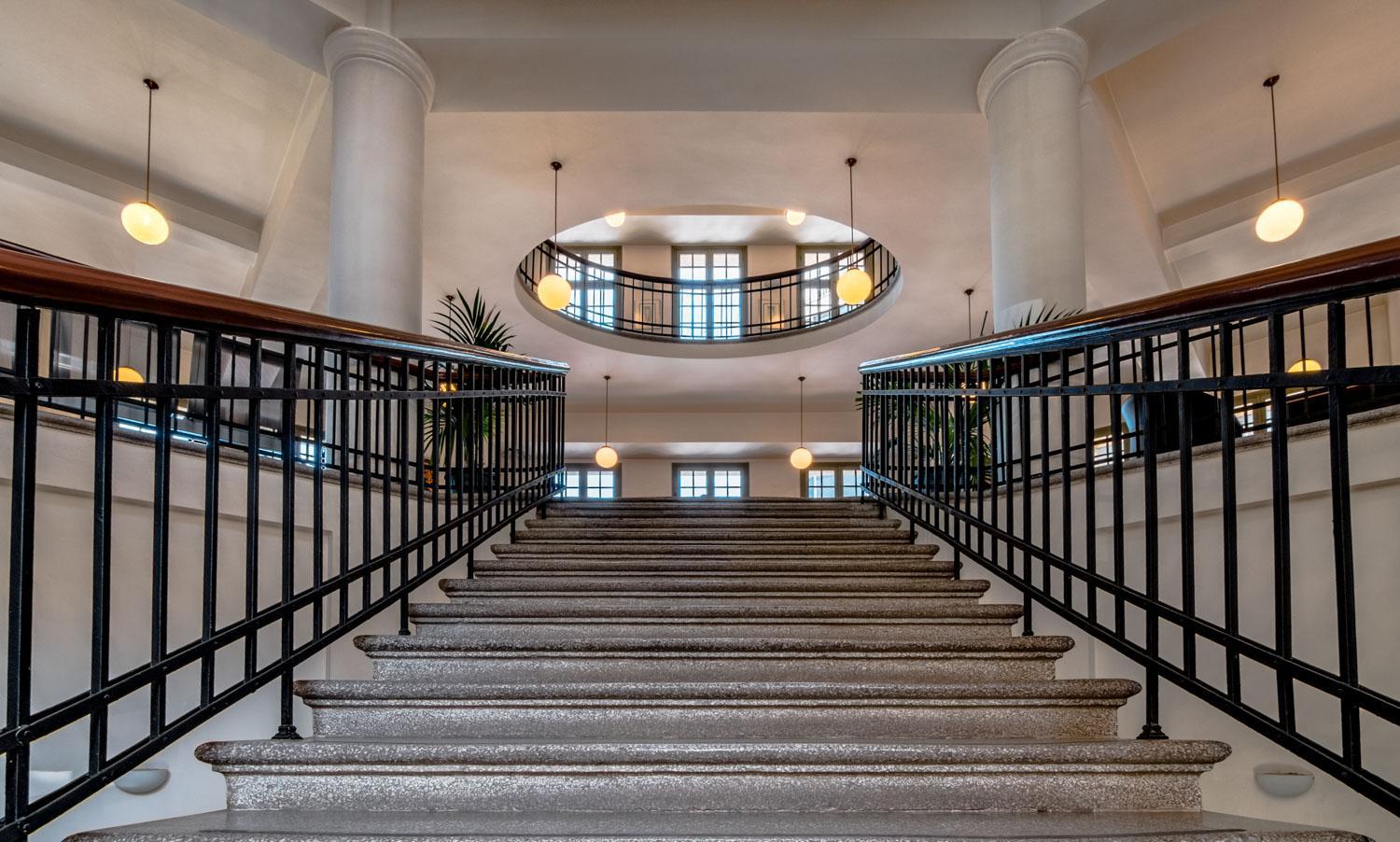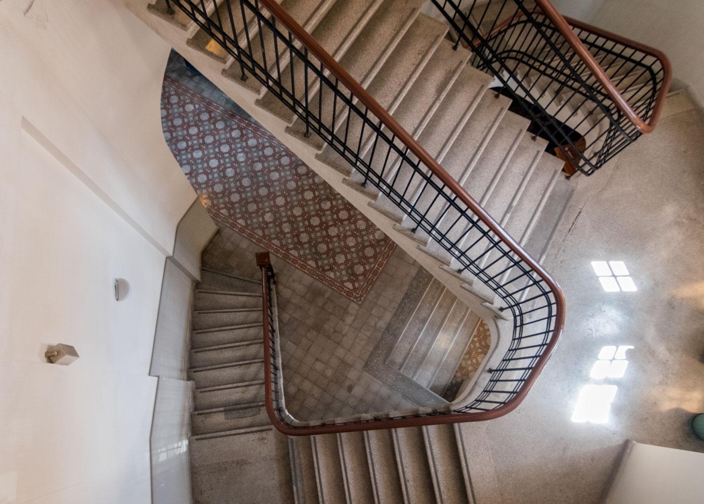 Ο εσωτερικός διάκοσμος του κτιρίου είναι απλός ενώ εντυπωσιάζουν οι σκάλες που οδηγούν στους ορόφους.