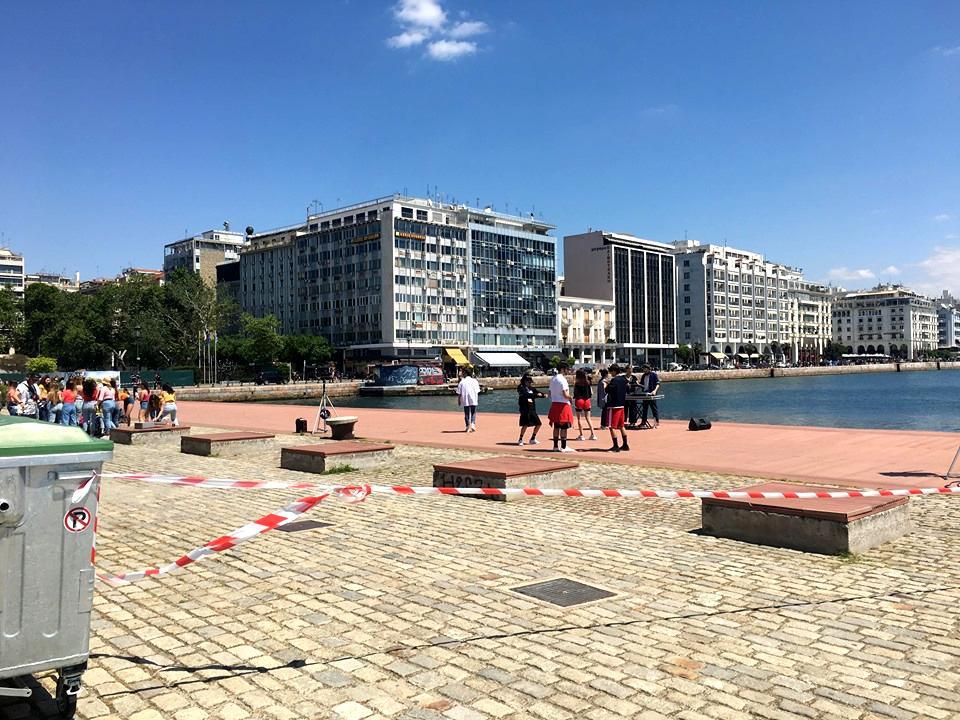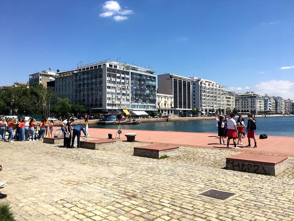 Οι νεαροί και οι νεαρές χορεύτριες κάνουν τις φιγούρες τους και ο γνωστός τραγουδιστής βγαίνει σέλφι με τον dj με φόντο τον Λευκό Πύργο: