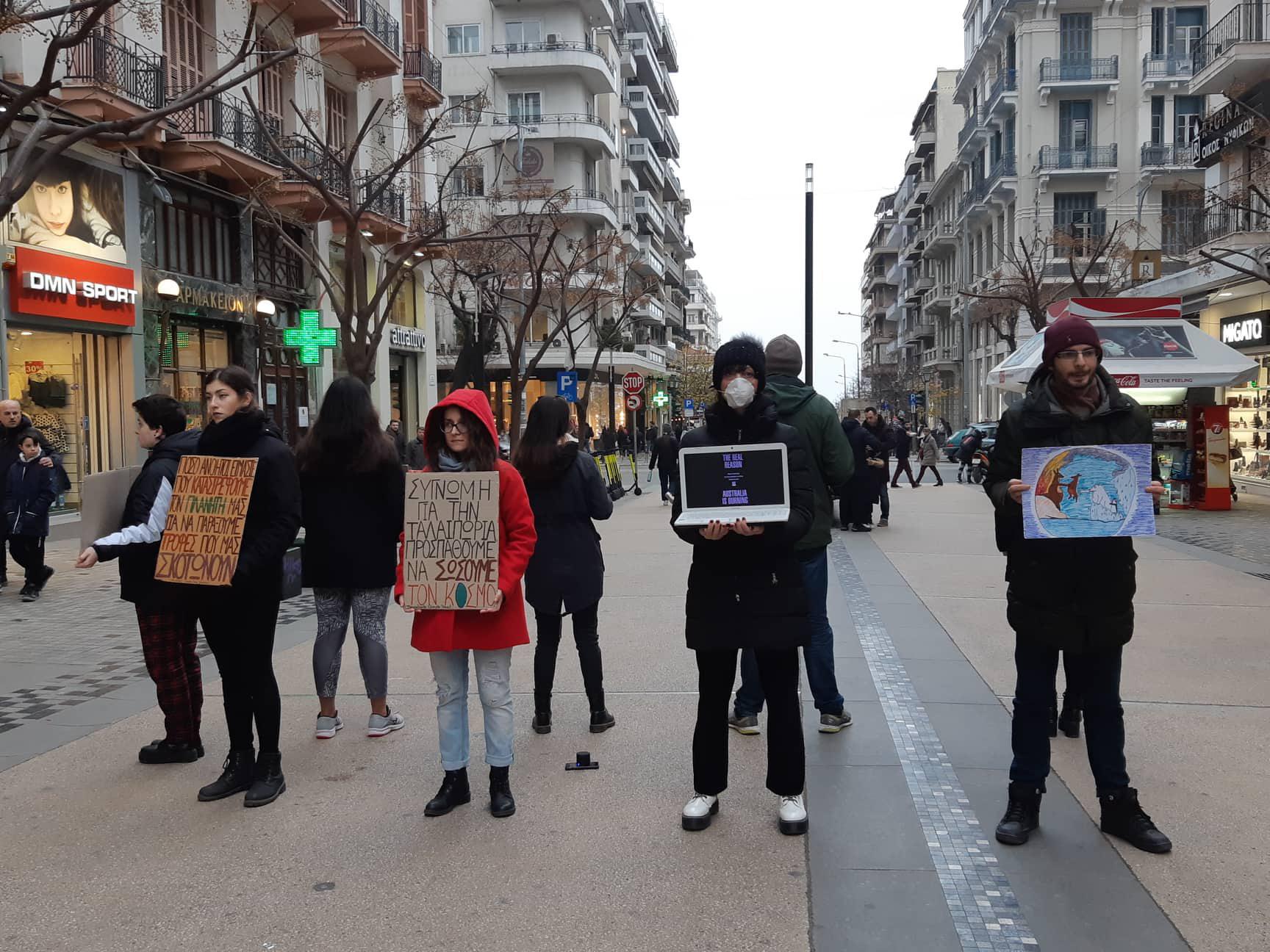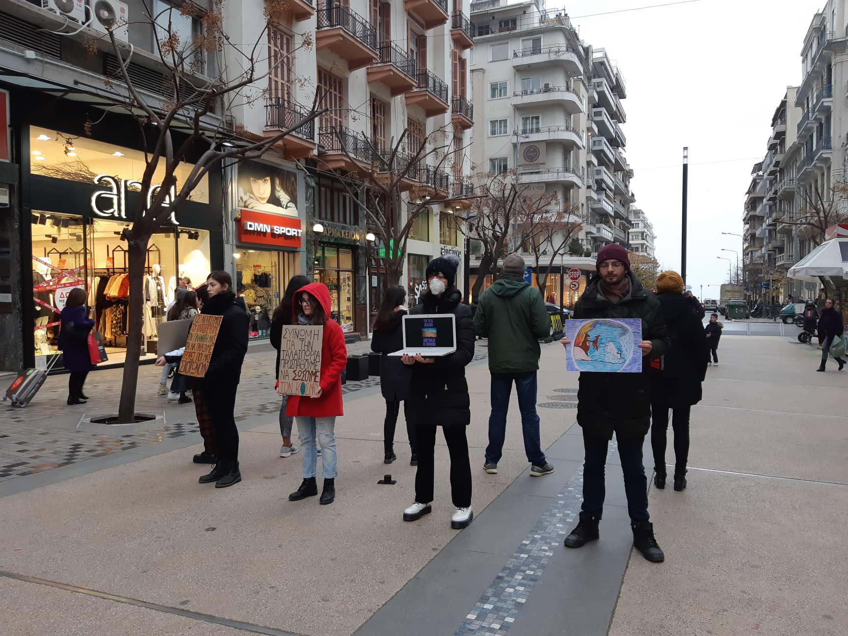 Η ομάδα ακτιβιστών Thessaloniki Climate Save πραγματοποιεί διαμαρτυρία για την κλιματική αλλαγή αυτή τη στιγμή στην Αγίας Σοφίας. Στο λάπτοπ παίζει βίντεο που δείχνει εικόνες από τις καταστροφικές πυρκαγιές που μαίνονται στην Αυστραλία.