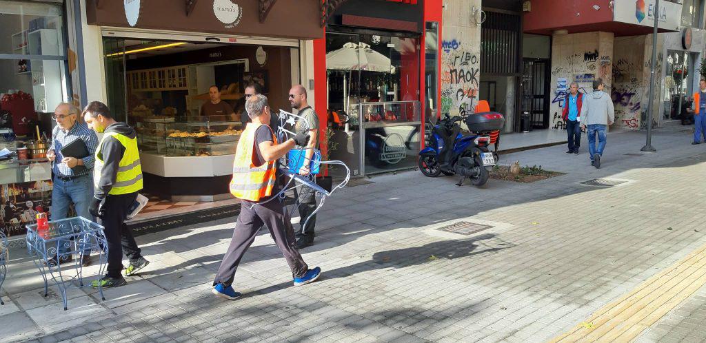 Μαζεύουν τραπεζοκαθίσματα από τον πεζόδρομο.