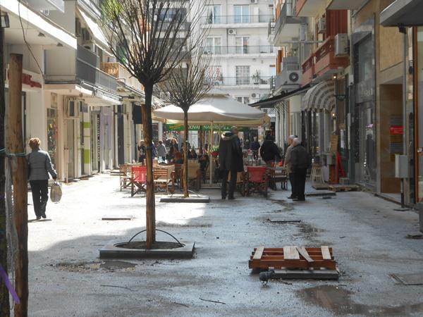 2. Μερικούς μήνες μετά τραπεζοκαθίσματα ήδη είχαν αρχίσει να απλώνονται στον πιλοτικό πεζόδρομο, όσο επέτρεπαν τα πρόχειρα παρτέρια που είχαν τοποθετηθεί. Όταν ξεκίνησαν οι εργασίες μαζεύτηκαν αναγκαστικά λόγω των σκαπτικών μηχανημάτων για να επανακάμψουν με τόλμη άμα του στρωσίματος με τσιμέντο. Τώρα που στρώνεται το δάπεδο εφαρμόζεται το σύστημα του σηκώνω λιγάκι τις καρέκλες στρώνεις το πλακάκι και αμέσως επαναφέρω στη θέση τους. Λες και δεν είναι εργοτάξιο η περιοχή, είναι το σαλόνι του σπιτιού μας. Πώς τραβάμε τους καναπέδες μας για να σκουπίσουμε από κάτω; Ένα τέτοιο πράγμα. Αν κρίνω δε από τις φωτογραφίες οι καταστηματάρχες προτού ακόμη ανακοινωθεί οτιδήποτε για την διάταξη των τραπεζοκαθισμάτων επί της Αγίας Σοφίας φρόντισαν να προμηθευτούν ολόκληρα σαλόνια. Κάτι θα ξέρουν παραπάνω από μας. Γιατί η πικρή αλήθεια είναι ότι δεν ξέρουμε τίποτα σχετικά με τις άδειες των τραπεζοκαθισμάτων όσον αφορά τους πεζόδρομους αφού η λέξη πεζόδρομος δεν αναφέρεται πουθενά στις νέες κανονιστικές που ψηφίστηκαν στο Δημοτικό Συμβούλιο πριν λίγες βδομάδες και όπου προσδιορίζεται με μαθηματική ακρίβεια το ποσοστό εκμετάλλευσης του δημόσιου χώρου επί των πεζοδρομίων (αλλά όχι των πεζόδρομων). Να σημειώσουμε πάντως ότι στη έννοια τραπεζοκαθίσματα περιλαμβάνονται μόνο τραπέζια – καρέκλες και σταντ – σκαμπό τα οποία δεν πρέπει να στερεώνονται με σταθερό τρόπο στο δάπεδο ή σε στοιχεία του κοινόχρηστου χώρου. Δεν επιτρέπονται βοηθητικοί πάγκοι και καναπέδες (περιλαμβάνεται στις νέες κανονιστικές για τον εξοπλισμό). Αλλά τι ξέρουν αυτοί;