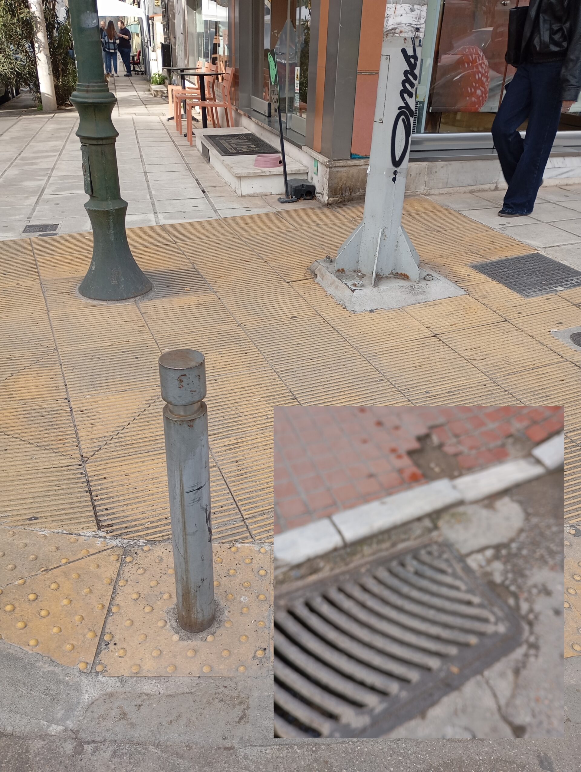 – Καταλήγουν στο οδόστρωμα με ένα μικρό σκαλοπατάκι, που εμποδίζει τα αμαξίδια, σε σχάρες από τα φρεάτια, όπου μπλοκάρουν οι ρόδες, σε πεζοδρόμια που είναι στενά ή έχουν στη μέση τους δέντρα και κολώνες.