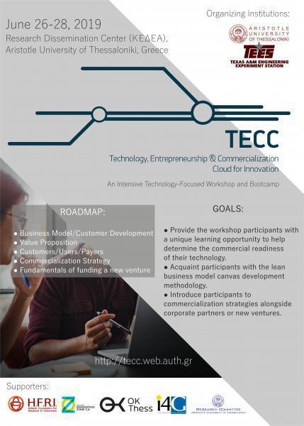 Το Αριστoτέλειο Πανεπιστήμιο Θεσσαλονίκης διοργανώνει τριήμερο Διεθνές Workshop και Bootcamp με τίτλο «TECC – Technology, Entrepreneurship & Commercialization Cloud for Innovation», σε συνεργασία με το Texas A&M Engineering Experiment Station (TEES) του Πανεπιστημίου του Texas A&M των ΗΠΑ, Ίδρυμα με το οποίο το ΑΠΘ διατηρεί Συμφωνία Επιστημονικής και Ερευνητικής Συνεργασίας από το 2011.