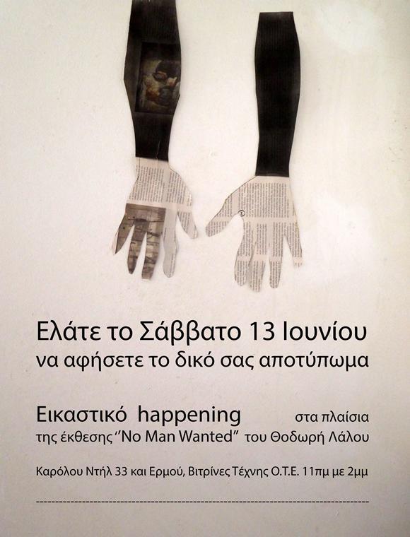 Τρείς βιτρίνες στο κέντρο της πόλης. Τρείς βιτρίνες διαφορετικές. Το πρωί με το θόρυβο των αυτοκινήτων, το βράδυ με τα φώτα μιας πόλης που κοιμάται. Υα λόγια αυτά περιγράφουν με τον καλύτερο τρόπο την εικαστική εγκατάσταση ‘’No Man Wanted’’ του Θοδωρή Λάλου, που πραγματοποιείται από 19 Μαίου εώς 13 Ιουνίου, στις Βιτρίνες Τέχνης του ΟΤΕ, Καρόλου Ντήλ 33 κι Ερμού.