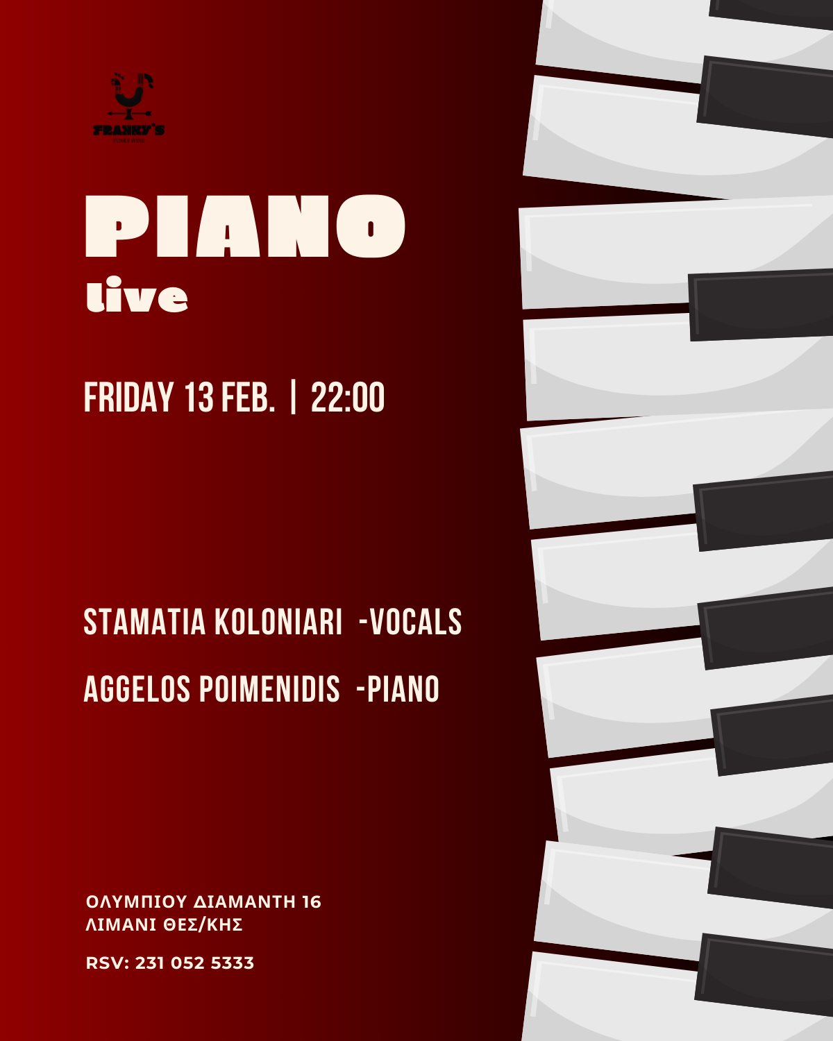 Την Παρασκευή 13 και το Σάββατο 14 Φεβρουαρίου, το Franky’s Funky Wine διοργανώνει δύο βραδιές ζεστές, μελωδικές και γεμάτες συναίσθημα με δύο μαγικά lives!