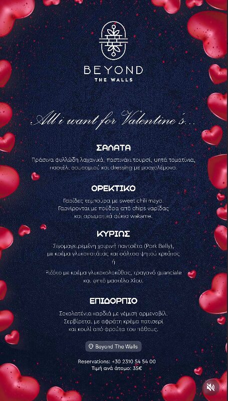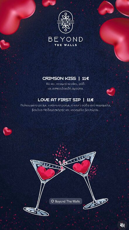Γι’ αυτό, το BEYOND THE WALLS, ετοίμασε με αγάπη ένα ξεχωριστό και λαχταριστό μενού αλλά και θεματικά κοκτέιλς, μόνο για την ξεχωριστή αυτή μέρα, για εσάς και το ταίρι σας…