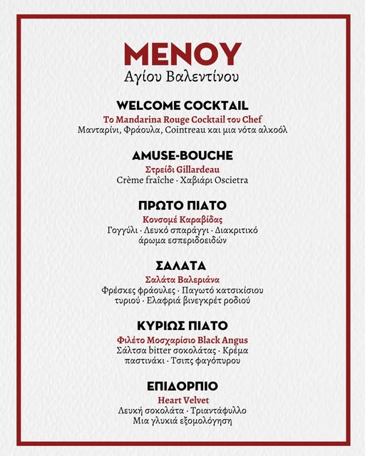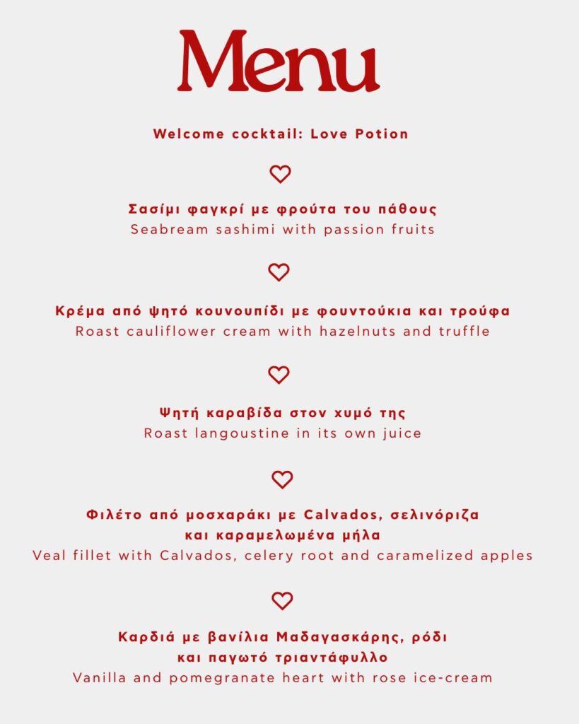 Μια βραδιά αφιερωμένη στην αγάπη, σε ένα ατμοσφαιρικό σκηνικό, με ένα μοναδικό Valentine’s set menu υπογεγραμμένο από τον Executive Chef Σωτήρη Ευαγγέλου και DJ Set από τον Dimitris Vakaros.