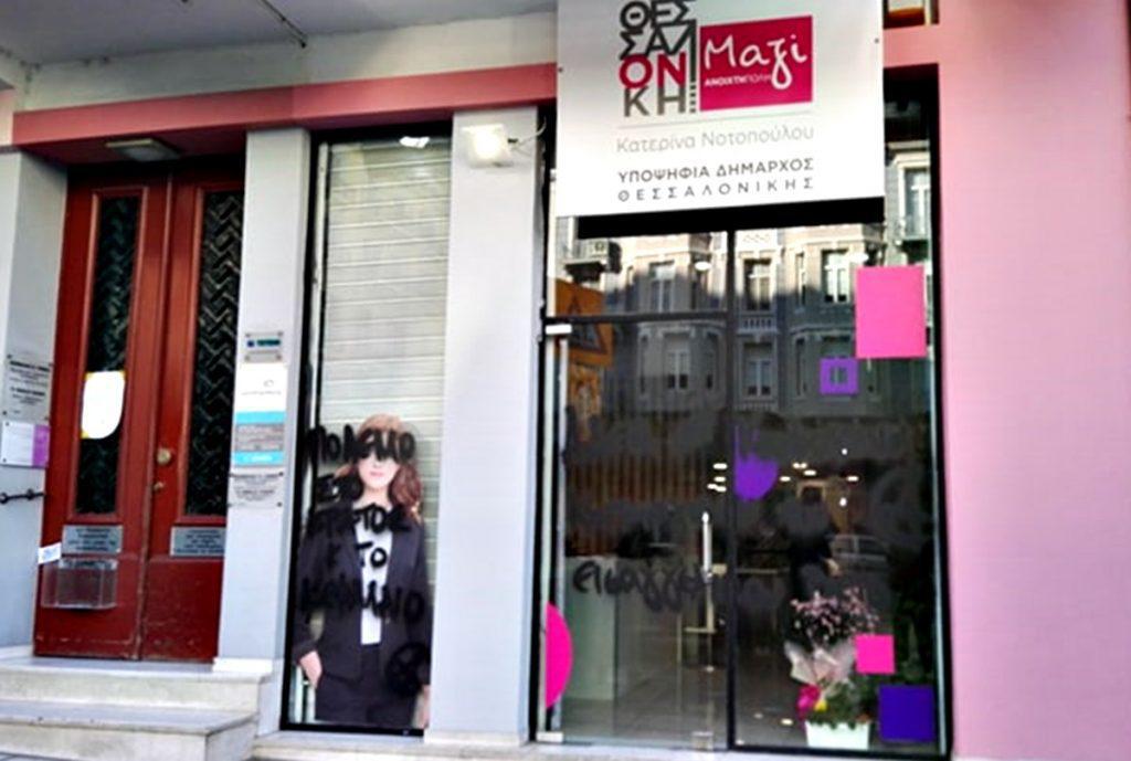 Oμάδα αγνώστων βανδάλισε χθες τη νύχτα το εκλογικό κέντρο της Κατερίνας Νοτοπούλου στον αριθμό 40 επί της Αγίας Σοφίας και το εκλογικό κέντρο του Νίκου Ταχιάου επί της Τσιμισκή στη Θεσσαλονίκη.