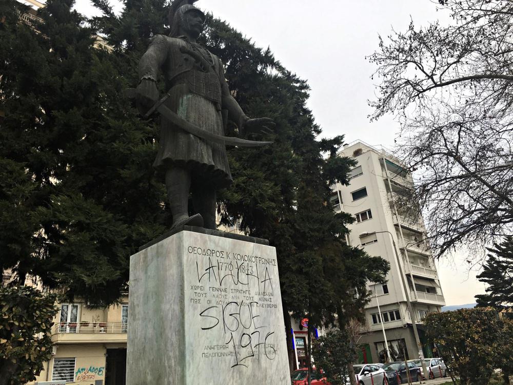 Άγνωστοι βεβήλωσαν το άγαλμα του ήρωα της ελληνικής Επανάστασης, Θεόδωρου Κολοκοτρώνη, γράφοντας με σπρέι μία φράση η οποία μεταφράζεται ως «ο αγώνας συνεχίζεται» και από κάτω την ημερομηνία 1976.