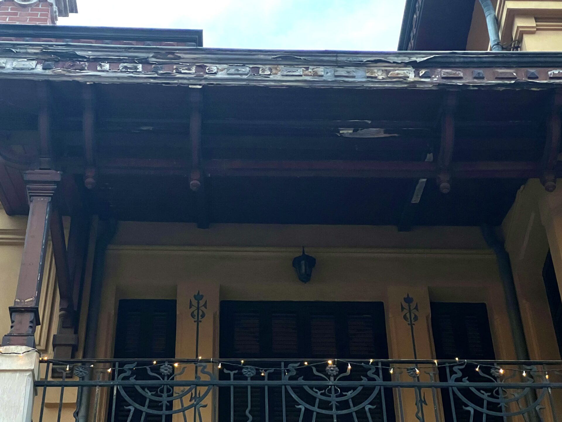 Τα ξύλινα παντζούρια είναι φθαρμένα και έχουν χάσει το χρώμα τους ασυντήρητα και άβαφα, έτοιμα να διαλυθούν. Οι υγρασίες είναι εμφανείς και εξωτερικά σε αρκετά σημεία όπως στα γυψινα του πρώτου ορόφου αλλά και στο κεντρικό μπαλκόνι, ενώ στη μετώπη τα ξύλα φαίνεται να έχουν σαπίσει και δεν είναι σπάνια η πτώση τούβλων και υλικών από την οροφή.