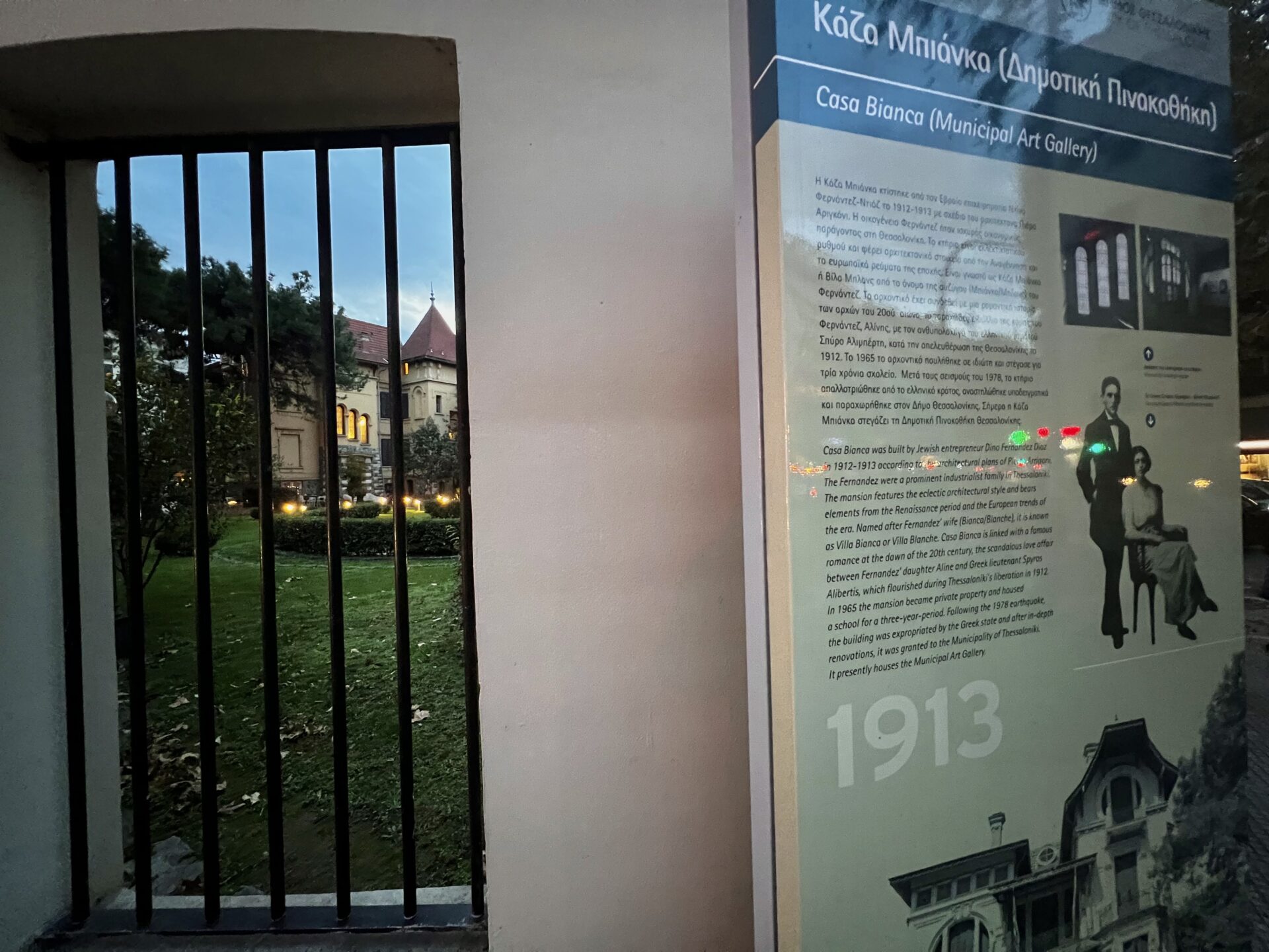 H Villa Fernandez, όπως αλλιώς ονομάζεται, κτίστηκε στις αρχές του αιώνα σε σχέδια του Ιταλοεβραίου αρχιτέκτονα Piero Arrigoni. Κατά τη δεκαετία του ’60, στον πρώτο όροφο της έπαυλης λειτούργησε νηπιαγωγείο και δημοτικό σχολείο και το 1976 κηρύχθηκε διατηρητέο μνημείο ενώ το 1990 η Casa Bianca περιήλθε στην ιδιοκτησία του δήμου Θεσσαλονίκης.
